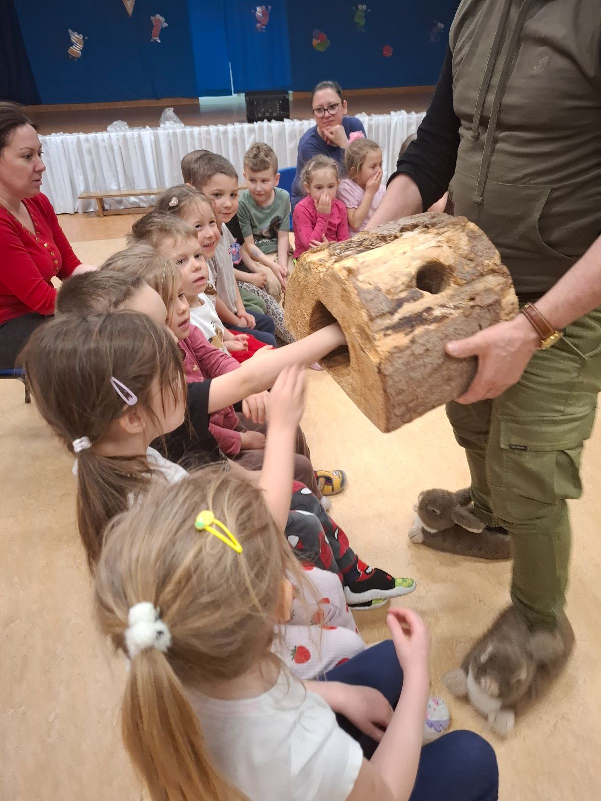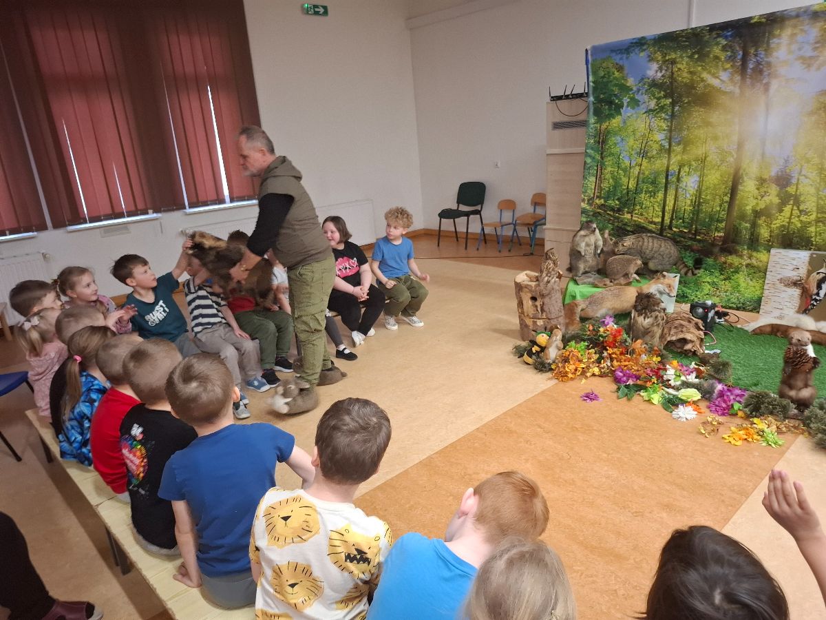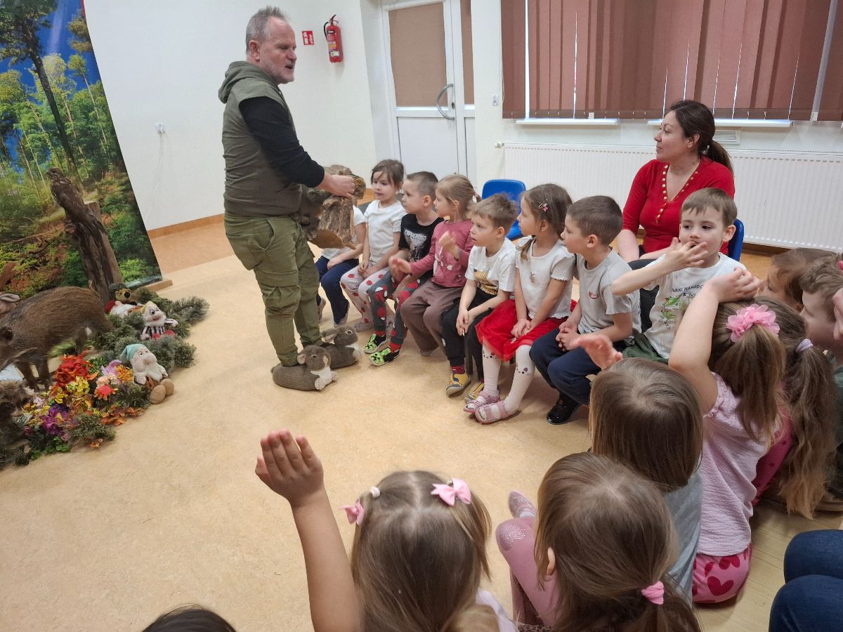 W czwartkowy poranek dzieci z naszego przedszkola uczestniczyły w warsztatach przyrodniczych „Las i jego mieszkańcy”, prowadzonych przez pana Aleksandra Rębacza – mistrza pszczelarstwa z pasieki ,,Boża Iskierka” z Męciny Małej niedaleko Krynicy Zdrój. Podczas spotkania przedszkolaki dowiedziały się, czym jest las oraz kto w nim mieszka. Poznały różne gatunki ptaków i zwierząt leśnych, a także ich zwyczaje i sposób życia. Ciekawym elementem warsztatów była możliwość dotknięcia: żbika, jenota, lisa, dzika Leosia czy jeża Tadzia. Dużym zainteresowaniem cieszyły się również odgłosy lasu, które dzieci próbowały rozpoznawać i naśladować. Na zakończenie spotkania przedszkolaki otrzymały od pana Aleksandra drobne upominki w postaci gipsowej sowy oraz papierowego mieszkańca lasu do pokolorowania i złożenia.