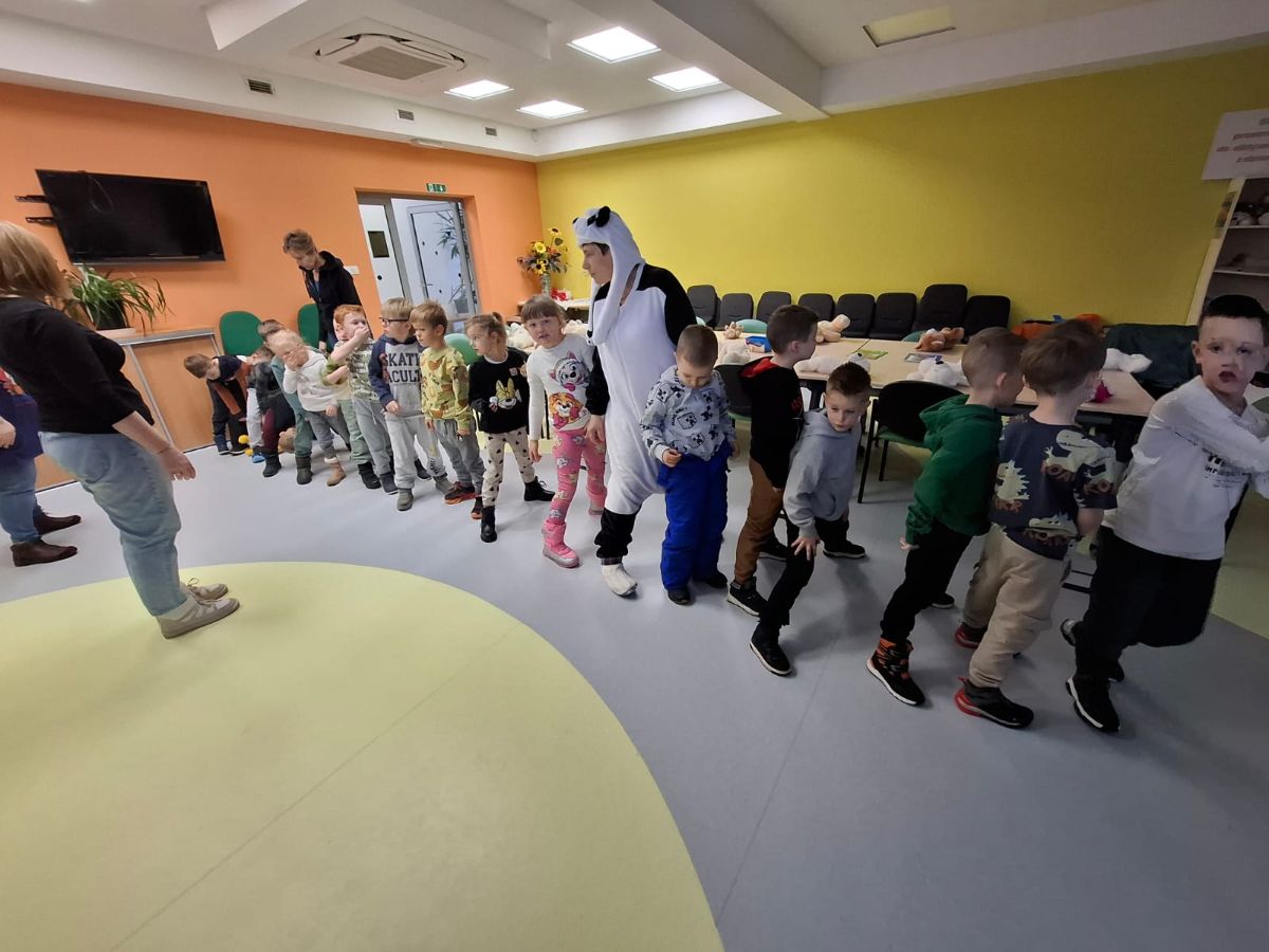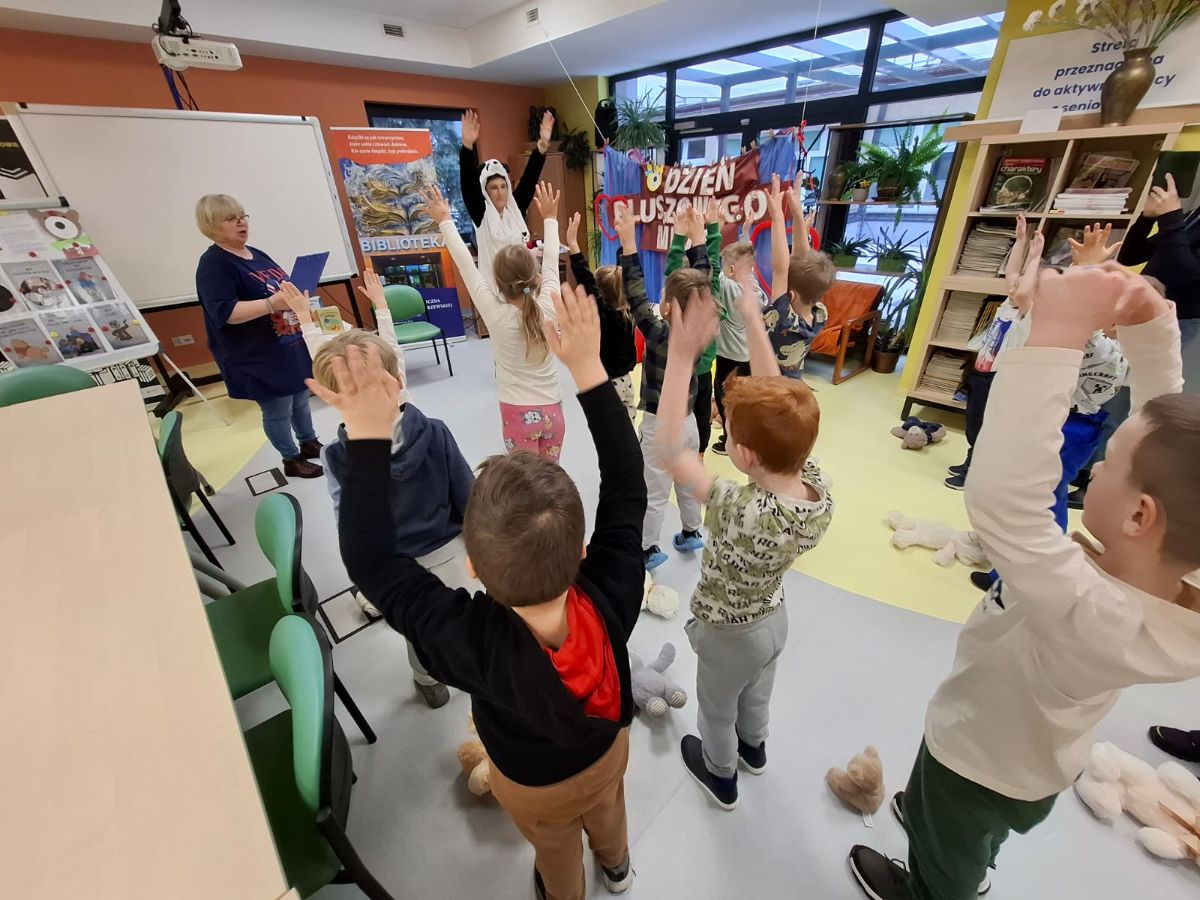 Na wejściu zostaliśmy powitani wierszem przez młodszą bibliotekarz Małgorzatę Samsonowicz oraz młodszą bibliotekarz Agnieszkę Sawińską – przebraną w strój misia pandy. Świętowanie rozpoczęliśmy od misiowej gimnastyki i tańca, po czym wysłuchaliśmy krótkiej historii o tym, skąd wziął się pierwszy pluszowy miś.