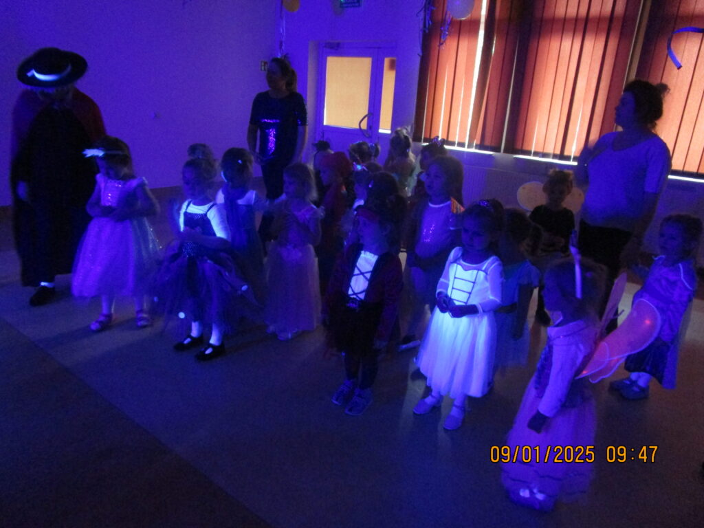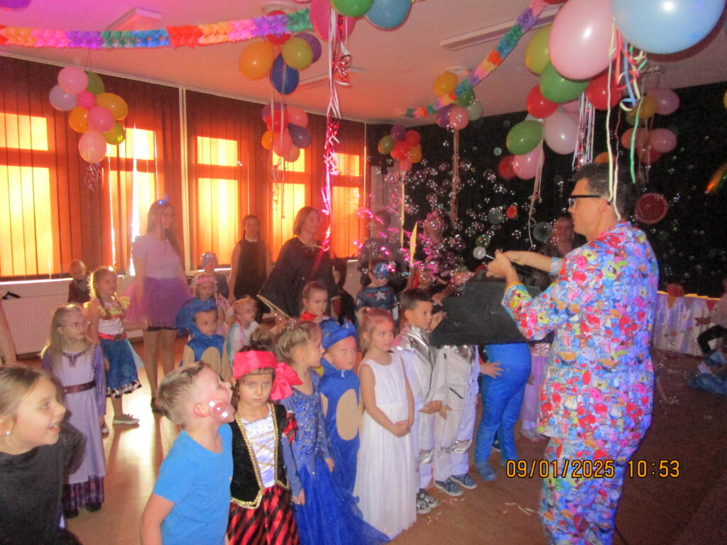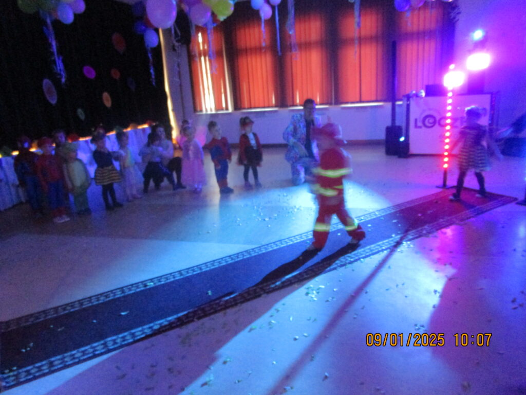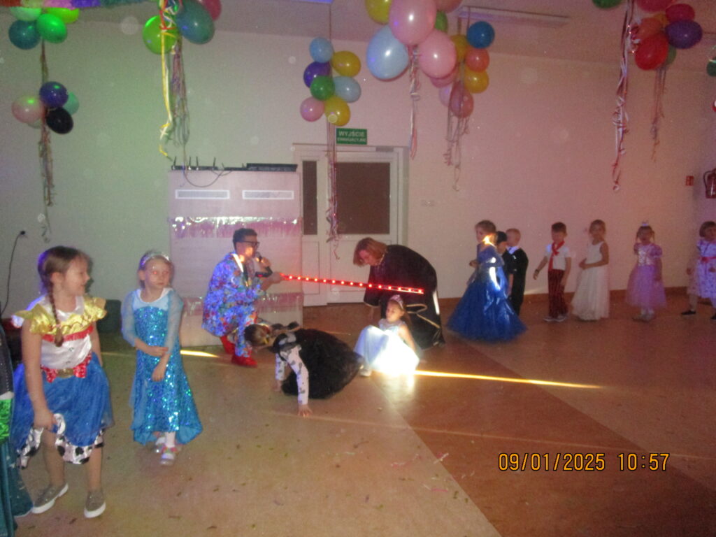 Kiedy pojawiły się pierwsze rytmy wesołej muzyki, to wszystkie przedszkolaki z wielką ochotą rozpoczęły pląsy i tańce. Wszyscy bawili się znakomicie z bardzo lubianym przez dzieci wodzirejem Loczkiem. Była cała moc atrakcji: taniec za laserowym limbo, piana party, bańki mydlane i dymne, konkurs z piłeczkami, pokaz tańca na czerwonym dywanie… jednym słowem zabawa na 102 !!! Gdy czas zabawy dobiegł końca dzieci z żalem opuszczały salę balową. Bal umożliwił dzieciom i wychowawcom spędzenie czasu w miłej atmosferze. Wspólna zabawa przyniosła wiele radości naszym wychowankom, co było głównym zamierzeniem tego balu.