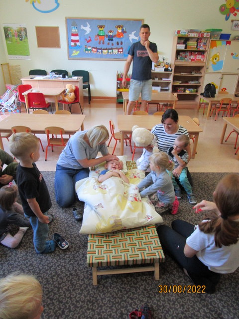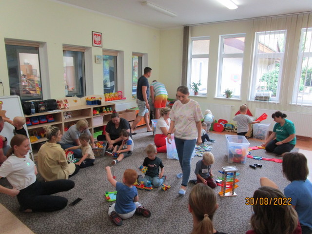 Mając powyższe na uwadze w dniach 29, 30 i 31 września 2022 r. w Publicznym Przedszkolu „Promyk Słońca” w Dziwnowie, w grupie V „Misie” rozpoczęły się dni adaptacyjne. Dzieci wraz z rodzicami zostały przywitane w szatni przedszkolnej i zaproszone do sali zabaw, w której dyrektor Renata Klimowicz przywitała przybyłych i przedstawiła personel pracujący w grupie „Misie”: p. Agatę Jurkowską – pomoc nauczyciela, p. Jolantę Chudy – woźną oddziałową oraz p. Annę Franczak – wychowawczynię grupy. Dzieci miały okazję poznać salę zabaw, kąciki zainteresowań oraz łazienkę, w której uczyły się myć rączki. Nie zabrakło zabaw muzyczno-ruchowych, zabaw metodą Weroniki Sherborne na sali gimnastycznej oraz zabaw dowolnych, podczas których rodzice zamienili się w „maluszki” pokazując swoim pociechom jak się bawić. Po zabawie dzieci szybciutko pozbierały zabawki. Wszystkie zabawki wróciły na swoje miejsce. Dzieci wykonały także swoją pierwszą pracę plastyczną – pod czujnym okiem rodziców zrobiły misia metodą origami z kółek. Pani Ania pokazała także, gdzie mieszkają sny w przedszkolu i obiecała, że kto pięknie zaśnie będzie śnił bajkowo, kolorowo. Następnie zmęczony, pluszowy miś został przebrany w piżamkę i mógł chwilę odpocząć na leżaczku. Dzieci bardzo chętnie próbowały, jak to jest poleżeć na leżaczku, na którym odpoczywamy po zabawie, spacerze i sytym obiadku. Dzieci zjadły również samodzielnie swój pierwszy obiad w przedszkolu. Na koniec spotkania panie zaprosiły dzieci na 1 września, gdzie bez mamy i taty będą poznawały siebie nawzajem oraz otaczający je świat.
