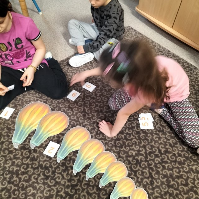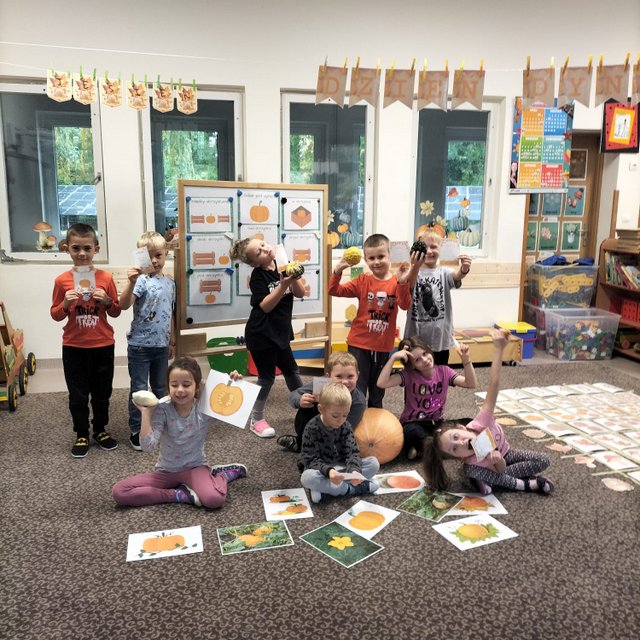 We wtorek 31 października w naszej Tygryskowej Grupie odbył się Dzień Dyni. Wszystkie dzieci uczestniczyły w zajęciach, podczas których poznały bardzo zdrowe i urodziwe warzywo jakim jest dynia. Dowiedziały się, że dynia jest bardzo zdrowym warzywem i, że można z niej przygotować wiele dań tj.: pieczywo, zupę, dżem, ciasto, babeczki, przetwory i soki. Następnie przedszkolaki przystąpiły do dyniowych zabaw: klasyfikowania dyń wg wielkości, koloru i kształtu, szeregowanie od największej dyni do najmniejszej, przeliczania dyń. Zajęcia skończyły się nauką piosenki „Dyniowa dyskoteka” oraz tańcami z balonami.
