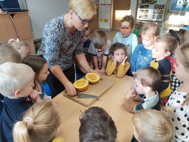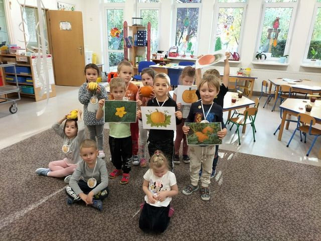 Przyniesione przez dzieci dynie pokazały nam ich różnorodność i wzbogaciły naszą wiedzę na ich temat. Dzieci poznały jak zdrowe i urodziwe jest to warzywo, że można przygotować z niej wiele dań tj: pieczywo, ciasto, przetwory i soki. Przekrojenie dyni pozwoliło nam poznać budowę dyni w środku i poznać tajemnicę: skąd się biorą pestki dyni ?