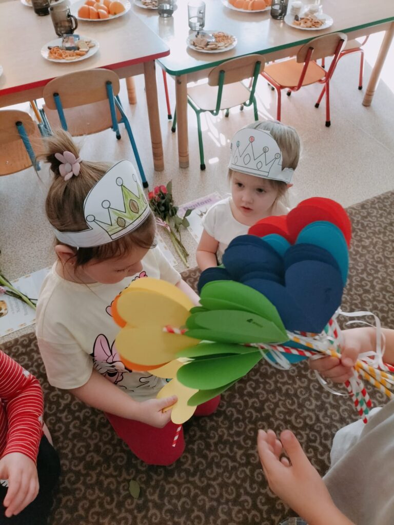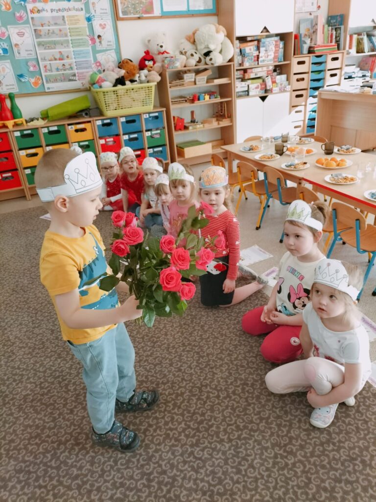W każdej grupie chłopcy złożyli dziewczynkom życzenia, dziewczynki zostały obdarowane drobnymi upominkami a także dostały przepiękne kwiaty. Chłopcy ze szczególnym zaangażowaniem starali się, aby ten dzień uczynić wyjątkowo miłym. Jako mali dżentelmeni wyręczali koleżanki w codziennych obowiązkach między innymi w porządkowaniu sali po zabawie. Było można usłyszeć taneczną muzykę, przy której bawiły się zarówno dziewczynki jak i chłopcy. Wiele radości sprawiły dzieciom przygotowane z tej okazji zabawy i konkurencje. Uśmiechnięte buzie przedszkolaków, a zwłaszcza dziewczynek świadczyły o miło spędzonym czasie.
