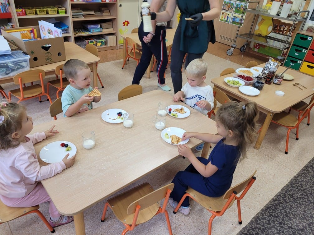 Wspólne zabawy taneczne przy piosenkach z dziecięcego repertuaru, zabawy ruchowe z chustą animacyjną, zabawy sportowe, medale, dyplomy, certyfikaty Przedszkolaka to nieliczne atrakcje, które czekały na dzieci w salach tego dnia. Dodatkowo dzieci z grupy V „Misie” wraz z paniami piekły gofry, które dekorowały pysznymi dodatkami. Natomiast „Duszki” skorzystały z zaproszenia i wybrały się na smakowite lody do kawiarni „Bacio cafe”.