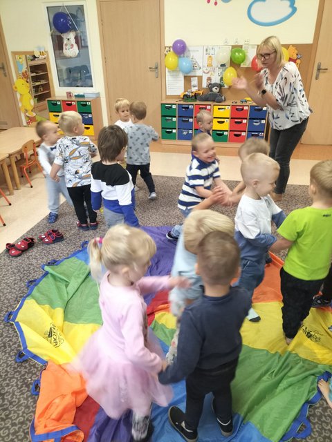 Dzieci z najmłodszej grupy „Misie” bawiły się przy ulubionych przebojach muzyki dla dzieci. Nie zabrakło także zabaw muzyczno-ruchowych i zabaw z chustą animacyjną Klanza, balonami oraz bańkami mydlanymi. Były także medale „Super przedszkolaka” oraz słodki poczęstunek. Celem zajęć było dostarczanie dzieciom okazji do świętowania, wesołej zabawy oraz czerpania radości z bycia przedszkolakiem.