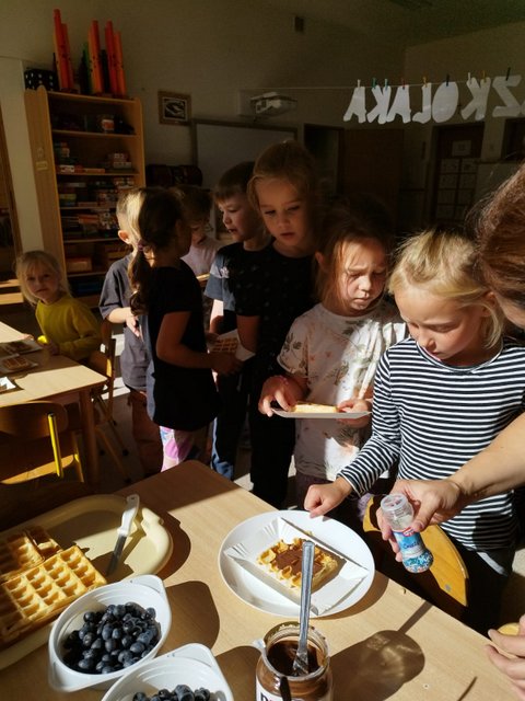 Najstarsza grupa „Gumisie” uczciła swoje święto piekąc smakowite gofry, które dzieci samodzielnie dekorowały i ze smakiem zjadały. Nie zabrakło również zabaw z chustą animacyjną Klanza oraz SIgumą do piosenek Marii Tomaszewskiej.
