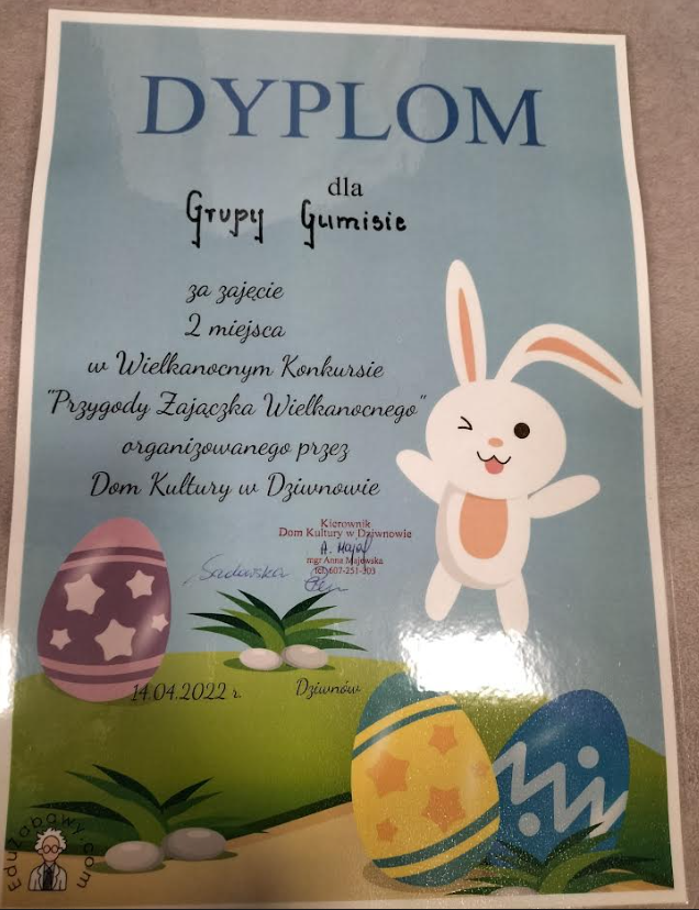 Wszystkie dzieci pracowały nad tekstem książki, a chętne robiły ilustracje. Tytuł książeczki to „ Zajączek Wielkanocny i Gumisie”. Opowiada ona o przygodach zajączka Mateusza, kurki Aldony i wiewiórki Ady. Wszyscy mieszkają w Dziwnowie i razem z dziećmi z grupy Gumisie pomagają kurce w malowaniu jajek.