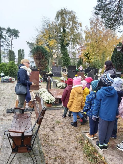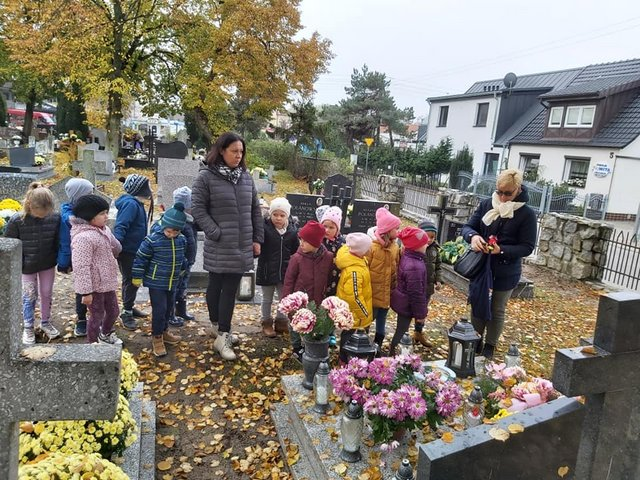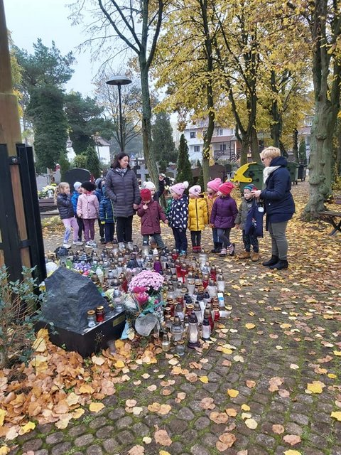 Listopad to czas pamięci i tych, którzy odeszli. Również nasze przedszkolaki uczą się pamiętania, gdyż dzięki pamiętaniu o innych Oni są wśród nas. Dzieci odwiedziły groby niektórych pracowników przedszkola i zapaliły lampki . Były to następujące groby: Marii Grabowskiej, Bogumiły i Władysława Waleryszaków, Ryszarda Robaszewskiego. Do innych byłych pracowników poszły dzieci z innych grup. Poza tym zapaliły również lampki pod krzyżem, by upamiętnić tych bliskich, którzy spoczywają w innych miastach. Jednak zauważywszy grób opuszczony i zaniedbany również postanowiły zapalić lampkę. Kochane te nasze Gumisie, jesteśmy z nich dumne.