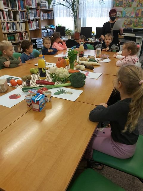 Celem spotkania było zgłębienie tematu „Zdrowy styl życia”. Dzieciom została przedstawiona Pani Dyrektor Biblioteki oraz Panie bibliotekarki. Po przywitaniu dzieci, które lubią spacery, lubią owoce i warzywa oraz gimnastykę Pani Iwonka przeczytała wiersz B. Lewandowskiej pt.: „ Na zdrowie” :