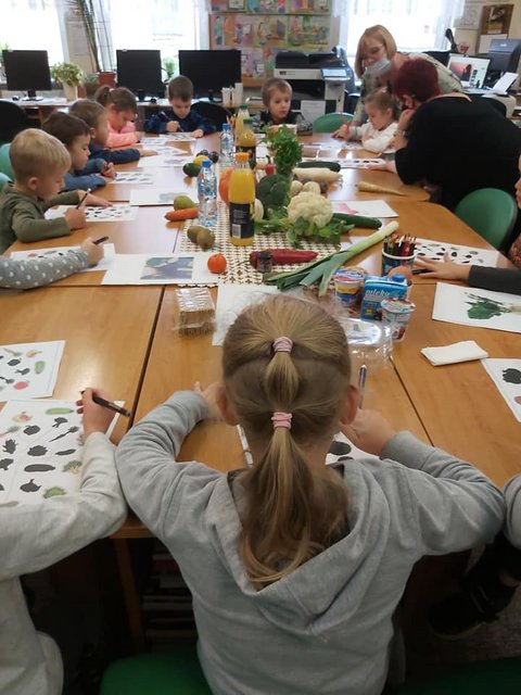 Następnie Gumisie wysłuchały wiersza J. Brzechwy pt.: „ Na straganie” który w wykonaniu Pani Małgosi wywołał uśmiech na ustach wszystkich dzieci , poznały piramidę żywieniową, chętnie poruszały się skacząc, kucając oraz wykonały pracę plastyczną.