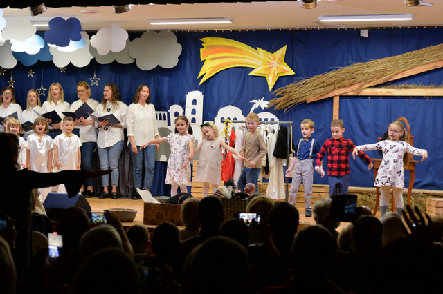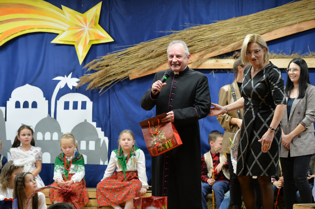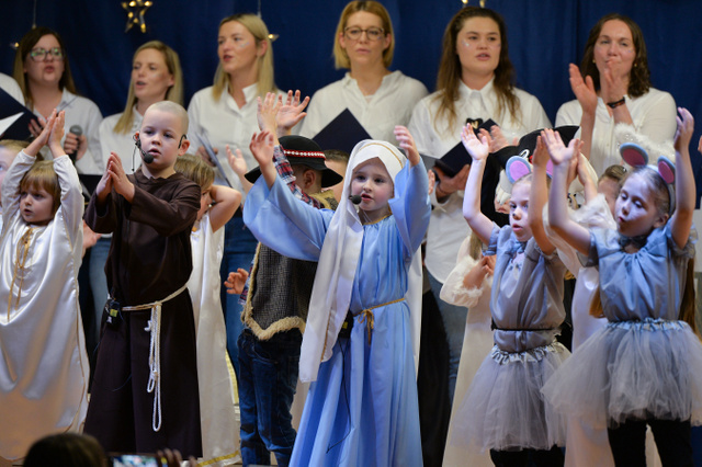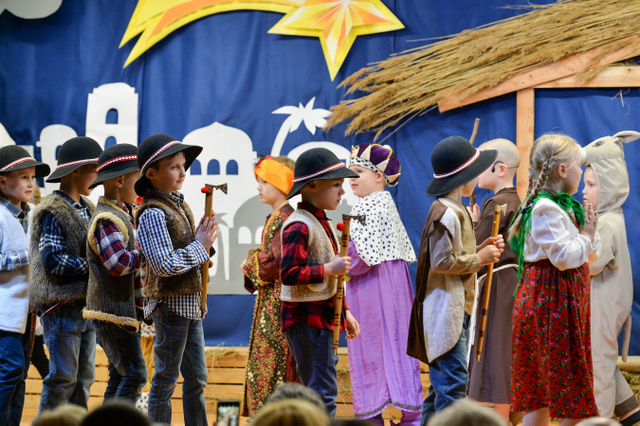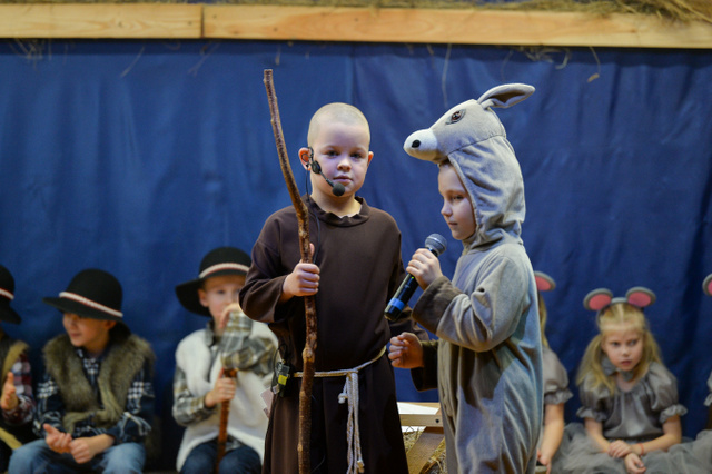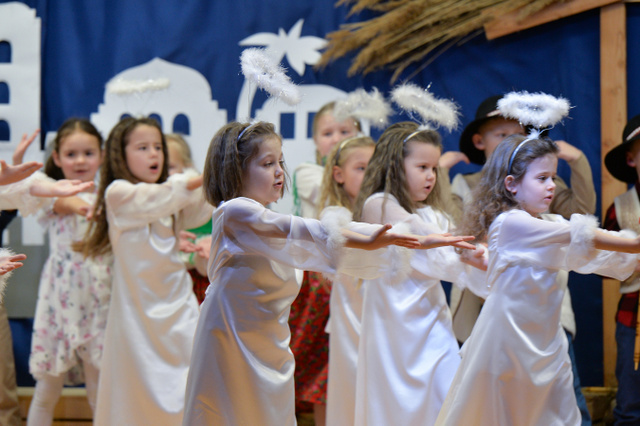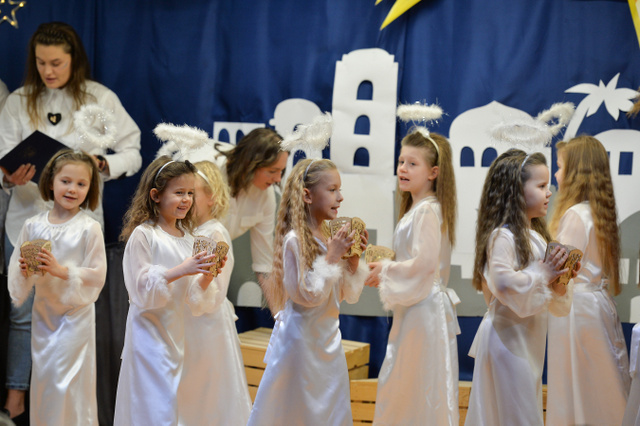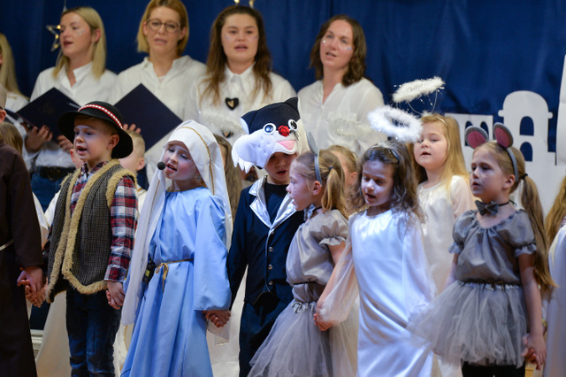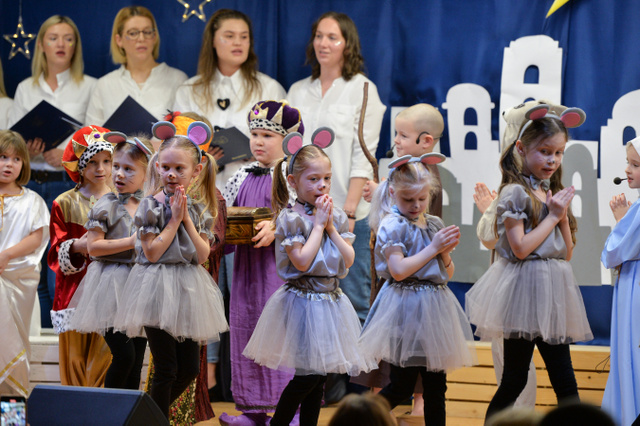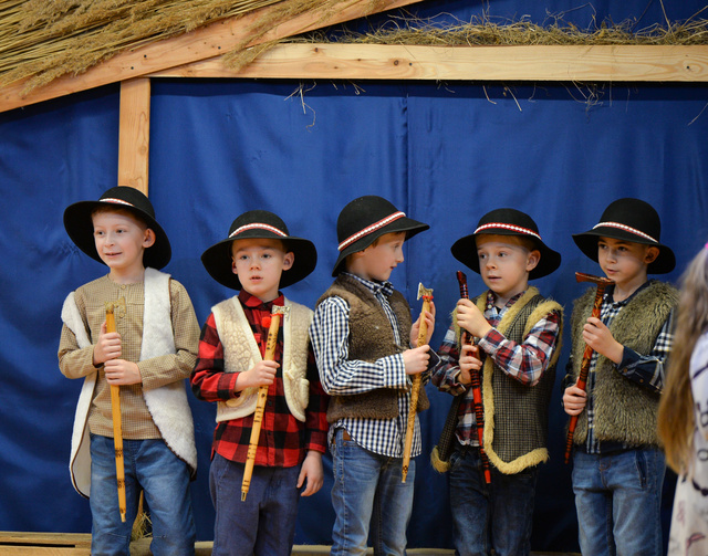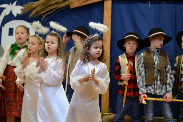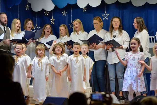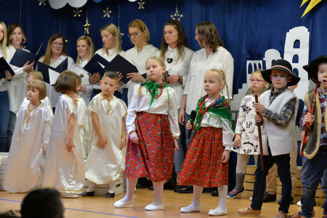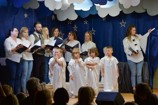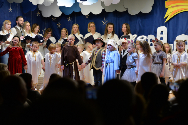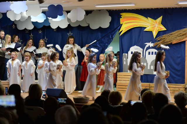14 grudnia 2023 r. o godz.16 15 , w sali widowiskowej naszego przedszkola, która w ten dzień za sprawą rodziców zamieniła się w Betlejem, dzieci z grypy „Gumisie” i „Tygryski” rozpoczęły jasełkowe przedstawienie. Świąteczny nastrój podkreślały niecodzienne stroje dzieci, bożonarodzeniowa dekoracja sali, przedszkolaki na moment przestały być zwykłymi dziećmi i zmieniły się w najświętszą rodzinę, anioły, pasterzy, pasterki, osiołka i królów, przenosząc wszystkich obecnych w czasy sprzed dwóch tysięcy lat. Mali artyści z dużym przejęciem i zaangażowaniem wiernie odtwarzali swoje role, prezentowali umiejętności recytatorskie i wokalne. Wszystkim przedszkolakom należą się ogromne pochwały za zaangażowanie, recytowane wierszyki, kolędy i pastorałki, dzięki którym stworzyły wspaniałą, świąteczną atmosferę i podbiły serca całej widowni.