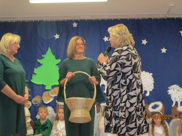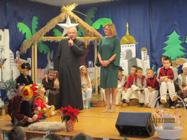 Po przedstawieniu pani Dyrektor wraz z Marią i Józefem złożyła wszystkim obecnym życzenia świąteczne i noworoczne. Zaproszeni goście oraz ksiądz proboszcz podziękowali aktorom i opiekunom za przedstawienie a dzieci otrzymały słodkie poczęstunki. Panie przedstawiły naszych bohaterów i role, które odgrywali i na zakończenie odśpiewana została jeszcze jedna pastorałka „Dzyń dzyń”.