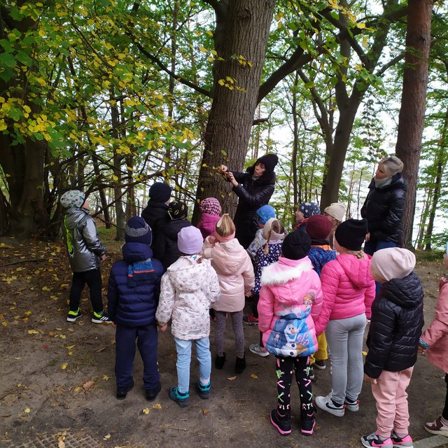 Wszystko co widać dookoła w przyrodzie świadczy o tym, że na dobre rozgościła się już u nas pani Jesień, z pewnością dla wielu najpiękniejsza pora roku. Wraz z jej nadejściem przedszkolaki lubią zbierać i gromadzić: kasztany, żołędzie, jarzębinę, liście i inne dary natury wykorzystywane podczas różnorodnych zajęć dydaktycznych w przedszkolu. W celu pogłębienia swojej wiedzy przyrodniczej, dzieci z grupy „Gumisiów” i „Tygrusków” wybrały się 19 listopada 2023 r. na „Jesienne warsztaty” do Centrum Współpracy Międzynarodowej w Grodnie. Dzieci miały możliwość uczestniczenia w zajęciach realizowanych w duchu idei leśnej edukacji stwarzającej alternatywne metody pracy z dziećmi, wykorzystującej przygodę jako czynnik sprzyjający rozwojowi oraz edukacji. Zajęcia prowadzone były przez panią Izabelę Biernat, absolwentkę Taksonomii Roślin i Ochrony Przyrody na Uniwersytecie Gdańskim oraz studentkę w Akademii Twórców Farrenhaita na kierunku rysunek i projektowanie. Łącząc swoje pasje z umiejętnościami, pani Izabela w interesujący sposób przekazała dzieciom wiedzę przyrodniczą i ekologiczną zachęcając je do kreatywnej, twórczej zabawy. Dzięki łączeniu różnych metod przedszkolaki bez problemu były w stanie rozpoznać z którego drzewa pochodzą znalezione liście, owoce i nasiona. Wykorzystując przyrodnicze znaleziska dzieci stworzyły piękne jesienne obrazki. Mogły również zweryfikować swoją dotychczasową wiedzę o przyrodzie w trakcie interaktywnej prezentacji, a spostrzegawczość sprawdziły podczas uzupełnianiu kolorowanki autorstwa pani Izabeli.