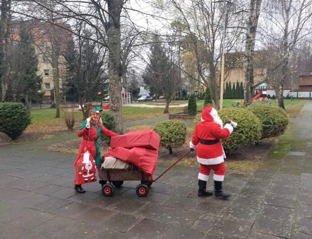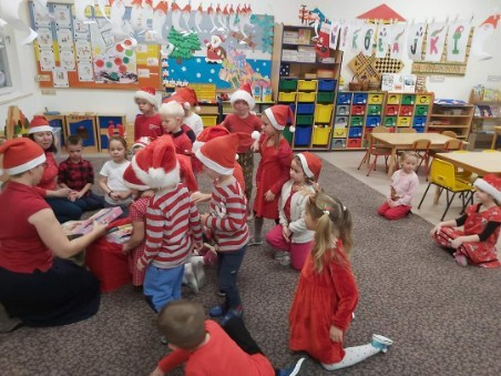 Panie Magdalena, Anita, Magda oraz Andżelika dla dzieci z grupy III „Gumisie” przygotowały fotobudkę „Mikołajki”, a także zabawy muzyczno-ruchowe do utworów o tematyce świątecznej oraz pracę grafomotoryczną „Prezent”.