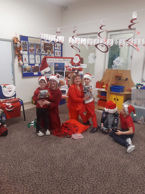 Mikołaja oraz Elfa powitała Pani dyr. Renata Klimowicz, która zaprosiła do odwiedzin i wręczenia prezentów naszym przedszkolakom. Przeprosiła, że nie może zaprosić Mikołaja do poszczególnych sal, nadmieniła, że musimy dostosować się do nowej „covidowej” rzeczywistości i przestrzegać sanitarnych nakazów. Przez drzwi balkonowe od strony przedszkolnego podwórka Mikołaj wraz z Elfem wręczyli wory z prezentami. Dzieci witały Mikołaja i dziękowały mu piosenką o tematyce świątecznej. Wszystkie dzieci oraz cały personel przedszkola ubrany był w mikołajkowe kolory tj.: biało-czerwone, co bardzo podobało się Mikołajowi. Wesołe zabawy mikołajkowe odbyły się w poszczególnych salach. Dzieci w tym dniu poznały „Historię św. Mikołaja”, w salach odczytano również list od św. Mikołaja. Dzieci układały Mikołajkowe puzzle oraz rysowały portret św. Mikołaja.