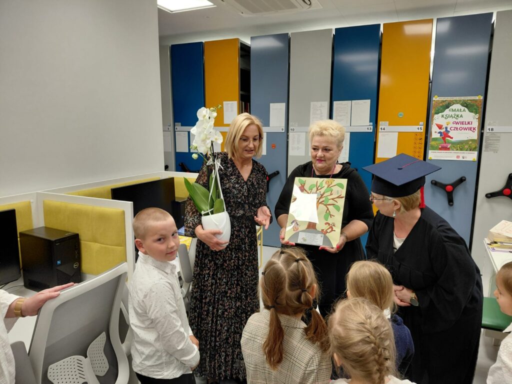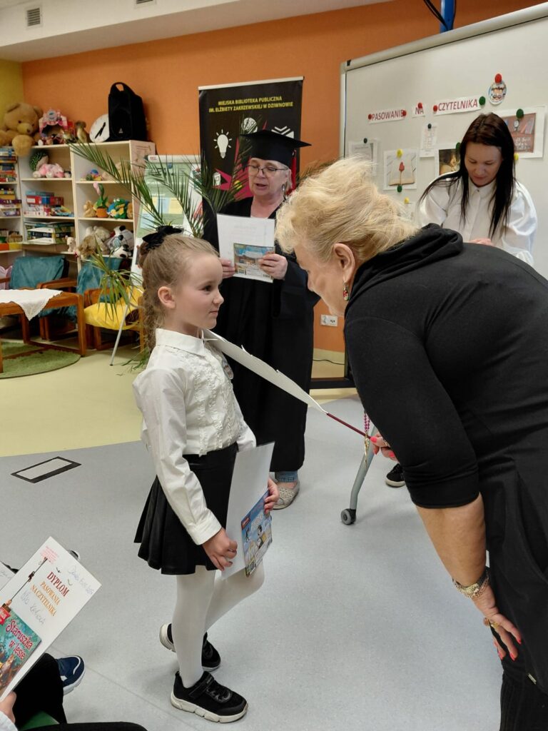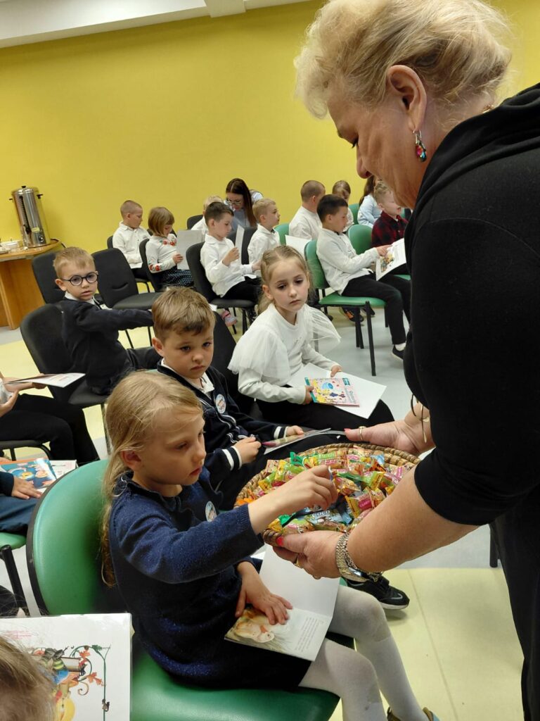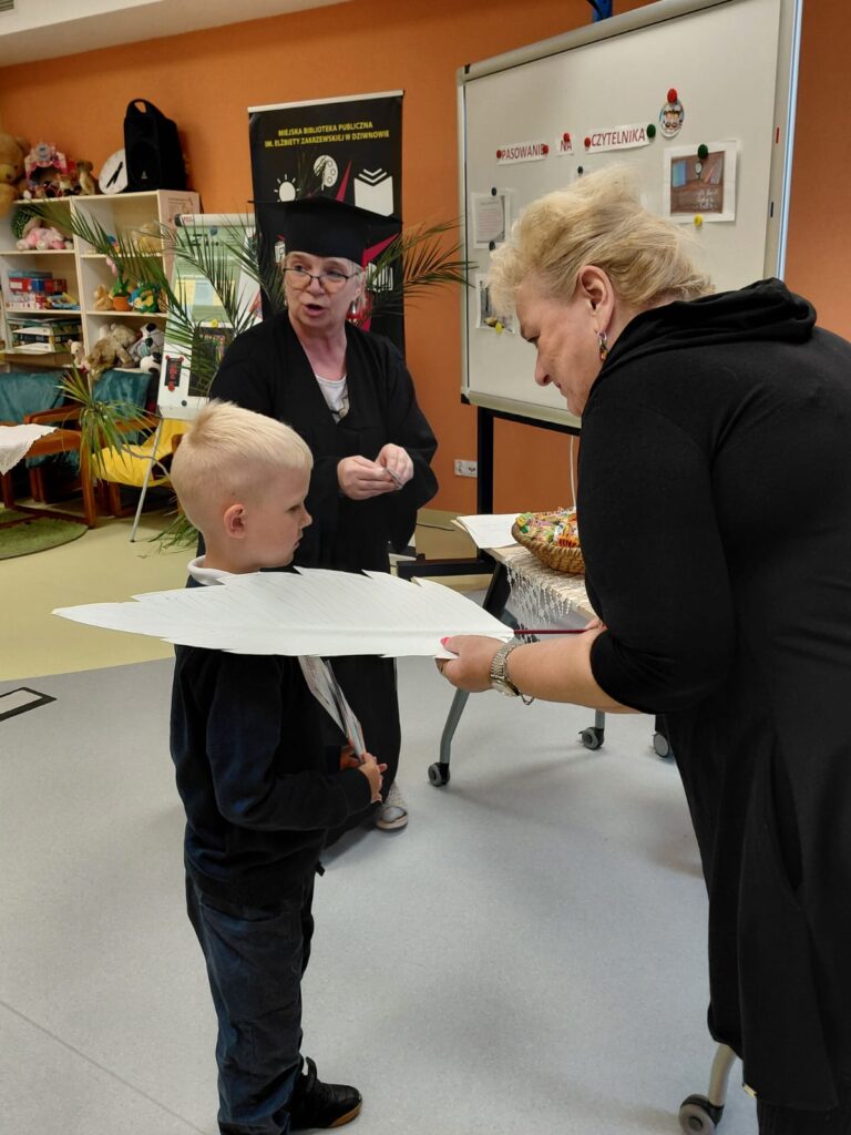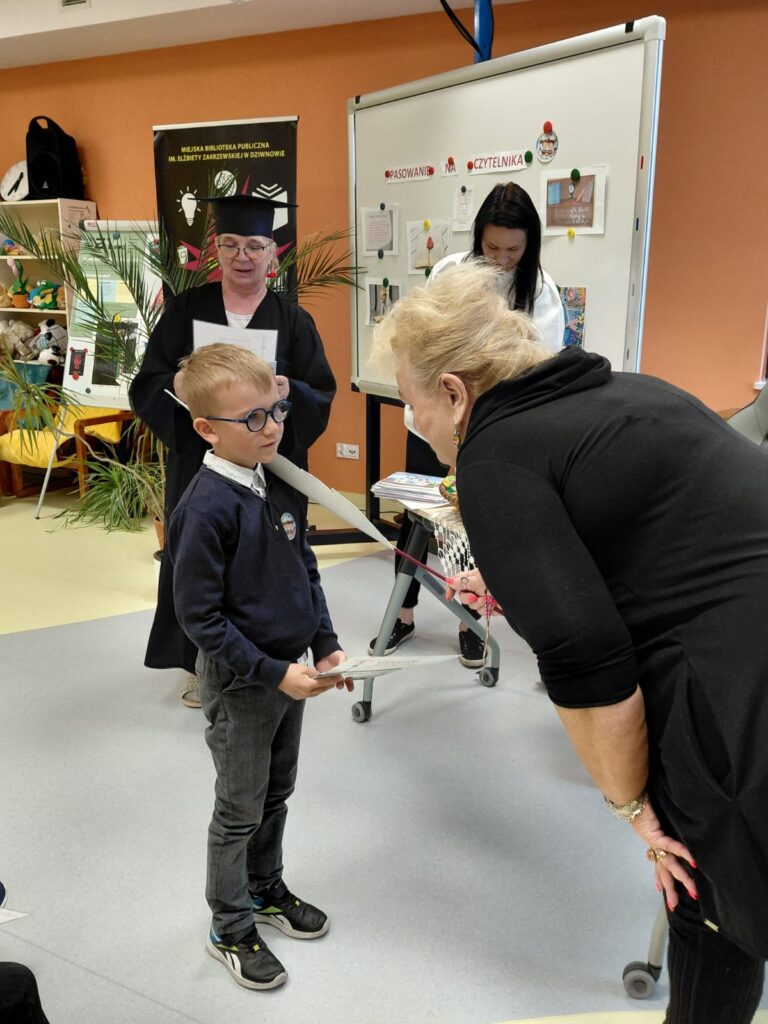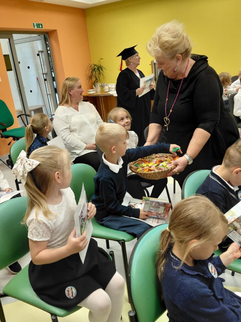 Rozmawialiśmy także o poszanowaniu książki i o zasadach dbania o te wypożyczone, a następnie panie z biblioteki przystąpiły do pasowania dzieci na czytelników. Każde pasowane dziecko otrzymało książkę, słodką niespodziankę oraz dyplom z tego wydarzenia, a pani dyrektor Renata Klimowicz złożyła na ręce pani Aliny Cygal Sobhi kwiaty oraz życzenia.