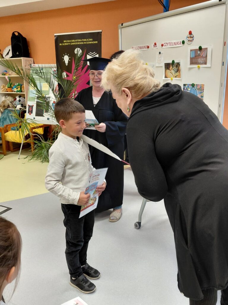 W czwartek, 15 maja pani dyrektor Renata Klimowicz oraz dzieci z grup Gumisie z panią Grażyną Redźko oraz pomocą Andżeliką Ratajską i Tygryski z panią Agatą Lelo- Stogowską oraz pomocą Agnieszką Śliwak zawitały do Miejskiej Biblioteki w Dziwnowie. Celem wizyty było nie tylko złożenie życzeń z okazji święta wszystkich Bibliotekarzy ale i Pasowanie na Czytelnika Miejskiej Biblioteki Publicznej im. Elżbiety Zakrzewskiej w Dziwnowie. Pasowane na czytelnika były dzieci, które już opuszczają przedszkole i idą do szkoły podstawowej.