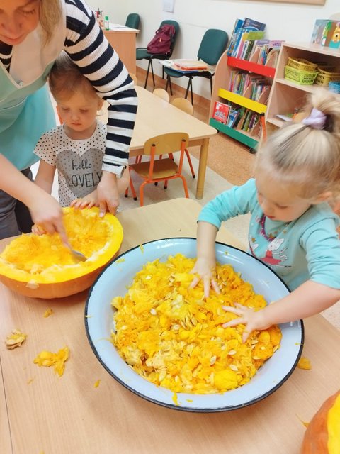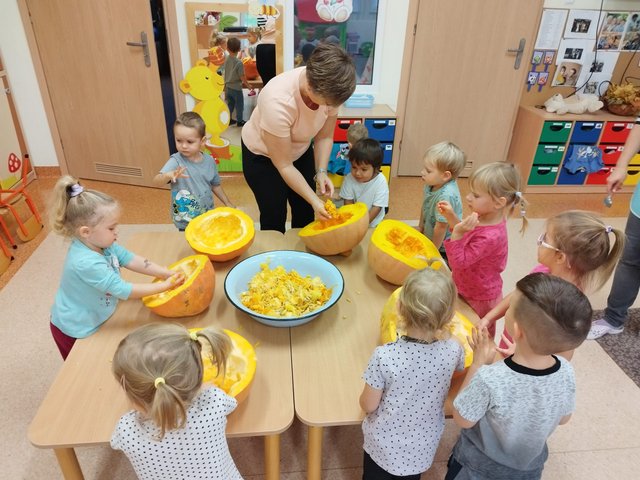 Wtorek 31.października do Dzień Dyni w grupie misiowej. Tego dnia dzieci zobaczyły ogromne dynie w sali przyniesione przez p. Szymona Waligórę, mogły ich dotknąć, powąchać i zobaczyć, jak wygląda w środku. Zabawa sensoplastyczna dynią to próba przez strachem dotykania substancji sobie nieznanych pod okiem nauczyciela. To niwelowanie niechęci i poznanie, że zabawa miąższem dyni przy wyciąganiu pestek może być fajna.