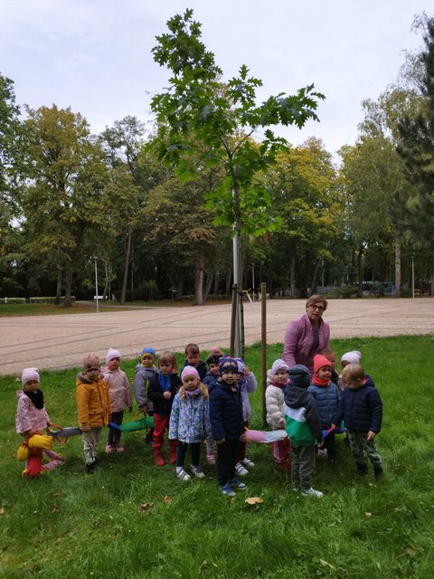 Dzień Drzewa – 11.10.2023 r. – tego dnia Misie rozmawiały o drzewach, ich znaczenia dla człowieka i zwierząt. Następnie wyszły na spacer do parku, by obserwować drzewa, dotykać ich, przytulać się do nich i poznawać ich dotyk. Z radością wspólnie wybrały drzewko w parku (dąb ), który będzie przez lata obserwowane i doglądane.