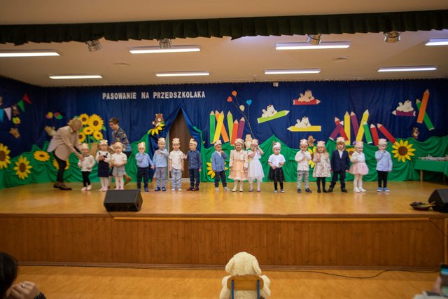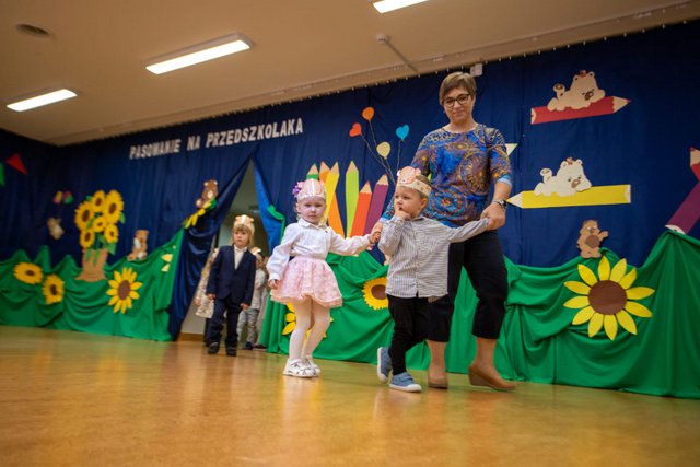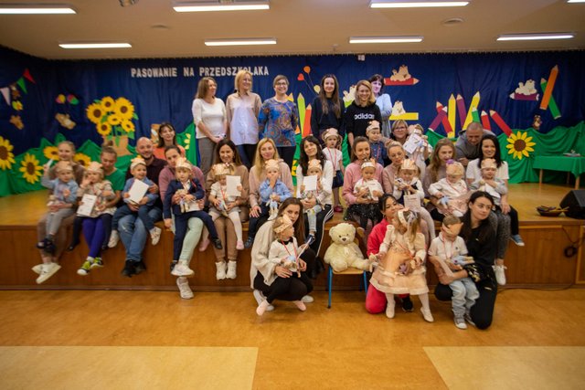 26.paździenika nastał dzień pasowania na przedszkolaka. Nie tylko dzieci przeżywały tę uroczystość – rodzice również byli zestresowani. Dzieci przedstawiły część artystyczną w postaci piosenek, układów tanecznych do piosenek, wierszyk. Z powodzeniem „zdały egzamin” a następnie wychowawczyni p. Magdalena Sowa dokonała uroczystego pasowania. Dzieci otrzymały dyplomy oraz upominki w postaci maskotki misia i uroczego misiowego medalu zakupionych przez rodziców z naszej grupy. Po części artystycznej rodzice przebrali dzieci w stroje sportowe, szybko pomogli uporządkować salę z krzesełek po to, by wspólnie bawić się z dziećmi podczas zabaw kierowanych przez wychowawczynie (M. Sowę oraz A. Chudy) metodą Ruchu Rozwijającego Weroniki Sherborne. Radości było bardzo dużo. Na zakończenie uroczystości rodzice szybciutko przenieśli przygotowane przez siebie stoły z poczęstunkiem i wszyscy mogli odpocząć po intensywnym dniu.