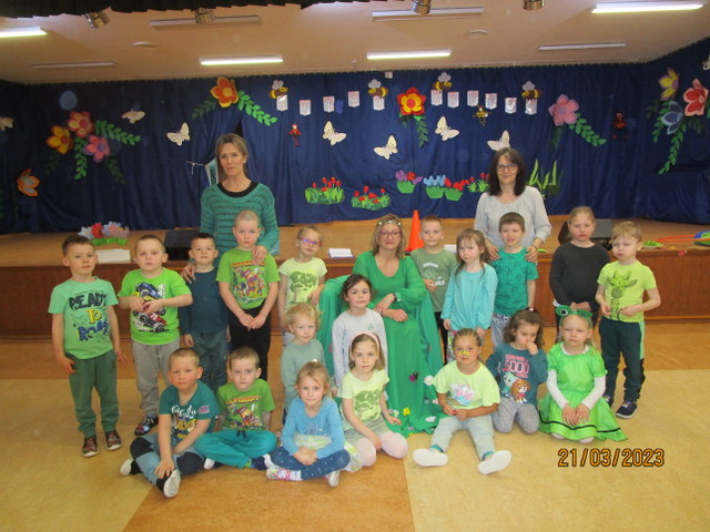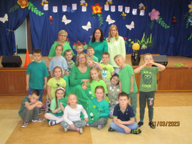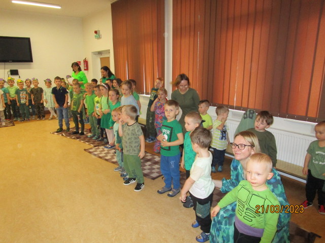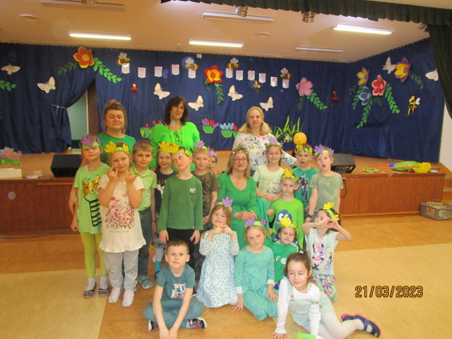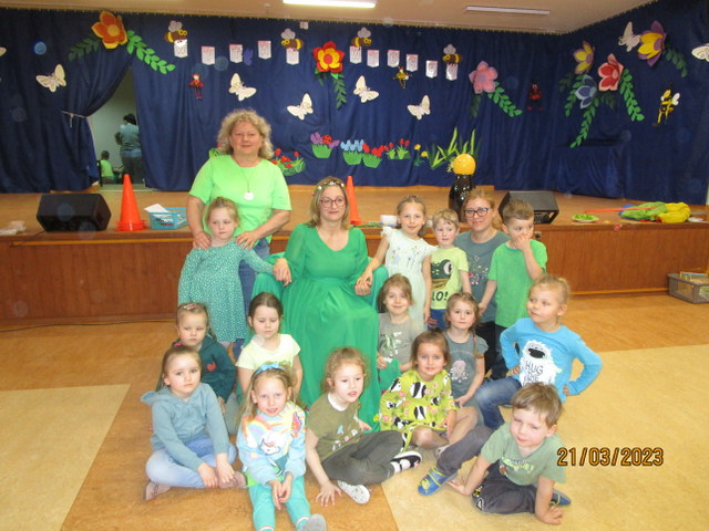 Po udanych zmaganiach sportowych, które przyniosły dzieciom dużo frajdy głos zabrała pani Wiosna. Podziękowała wszystkim przedszkolakom za ciepłe i serdeczne przyjęcie i pomoc w wydostaniu się z pieczary pani Zimy. Wiosna zaprosiła dzieci na wiosenny spacer i poprosiła, żeby miały oczy i uszy szeroko otwarte i szukały oznak jej przybycia. Dzieci rozstały się z panią Wiosną piosenką „Zielono tu”, a ona sama udała się w dalszą drogę budzić przyrodę z zimowego snu…