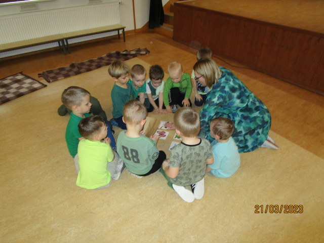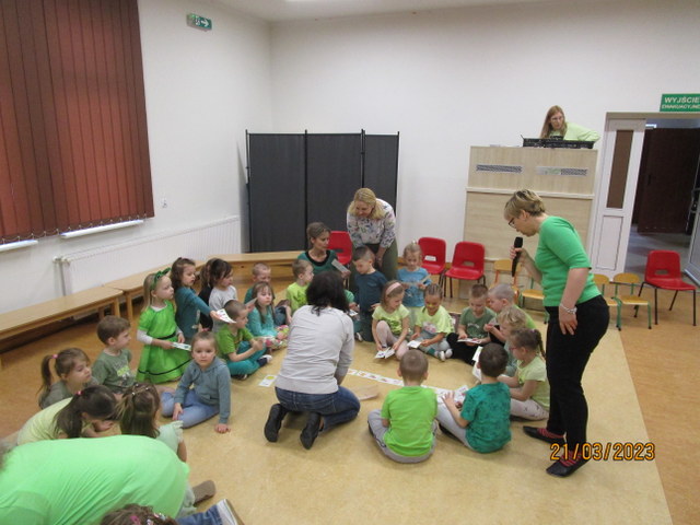 Pierwszym zadaniem było odgadniecie specjalnej wiosennej zagadki, z którą każda grupa świetnie sobie poradziła. Kolejnym zadaniem było określenie, czy przeczytane zdania są prawdziwe, czy też fałszywe. Przy prawdziwym dzieci miały podskoczyć, a przy fałszywym kucnąć. Z tym zadaniem również dzieci doskonale sobie poradziły.