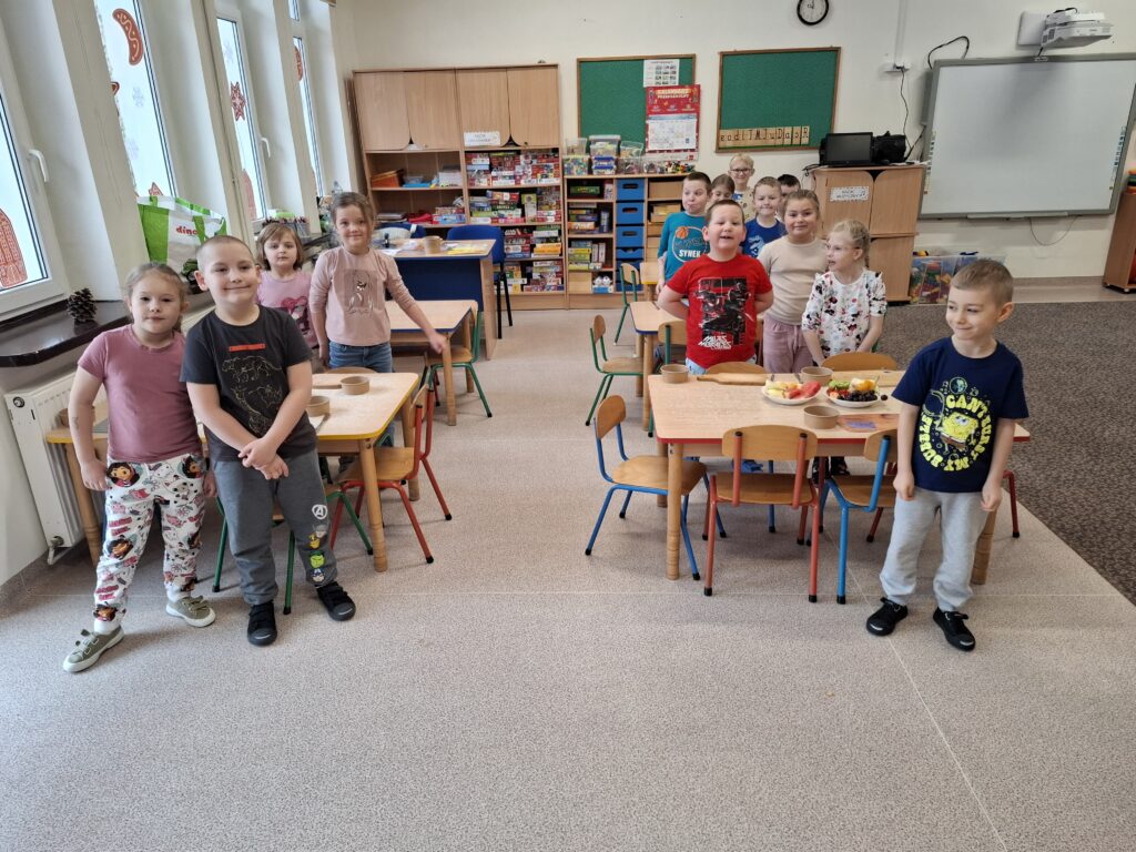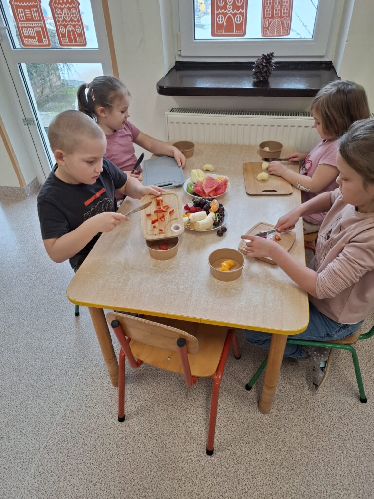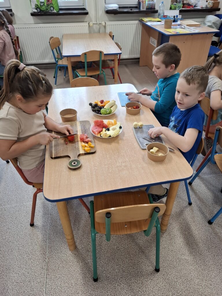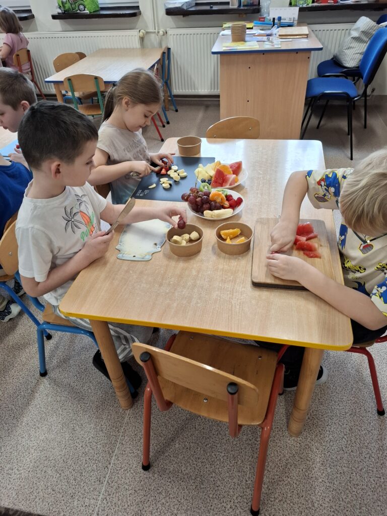 W związku z tematem tygodniowym „W zdrowym ciele zdrowy duch” oraz realizacją projektu edukacyjnego „Zdrowo i aktywnie – przygoda ze zdrowym stylem życia” dzieci z grupy „Tygryski” samodzielnie przygotowały sałatkę owocową. Wśród owoców do wyboru znalazły się: jabłka, gruszki, banany, winogrona, brzoskwinie, pomarańcze, kiwi, truskawki, maliny, borówki i arbuz. Pamiętając o zasadach higieny, przed przystąpieniem do pracy wszyscy dokładnie umyli ręce i zabrali się do przygotowywania witaminowych smakołyków. W tym dniu każdy Tygrysek przyniósł deskę do krojenia oraz wykazał się umiejętnością bezpiecznego posługiwania się nożem podczas krojenia owoców na małe kawałki. Dzieciom bardzo smakowały owoce w takiej postaci, tym bardziej że był to efekt ich kulinarnej przygody.
