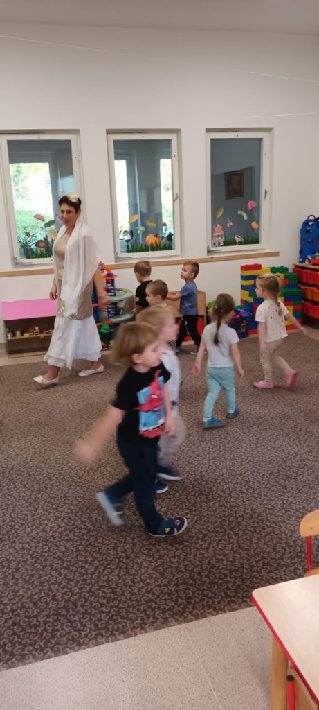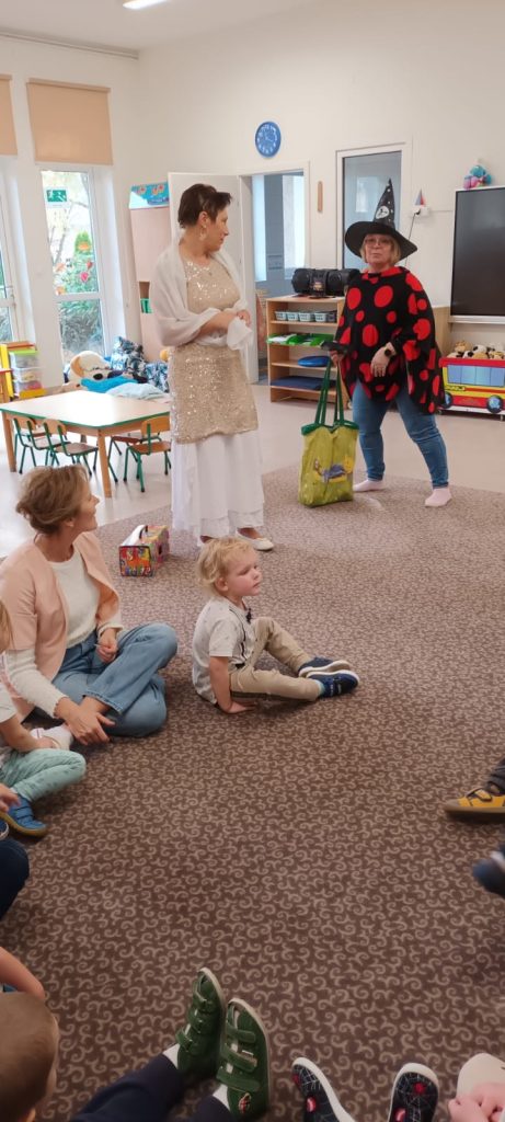 Celem wizyty było rozwijanie wyobraźni dziecięcej, inspirowanie dzieci do wyrażania treści bajek w formie ekspresji ruchowej oraz oczywiście rozwijanie zainteresowań dzieci bajkami.