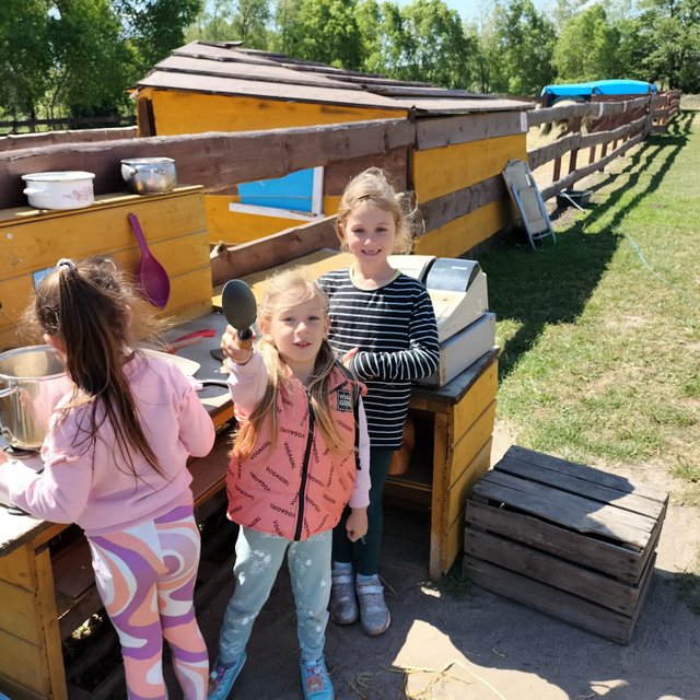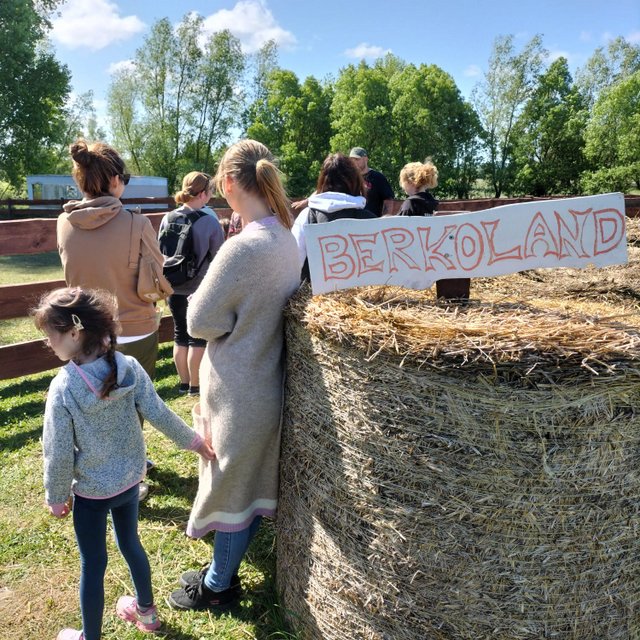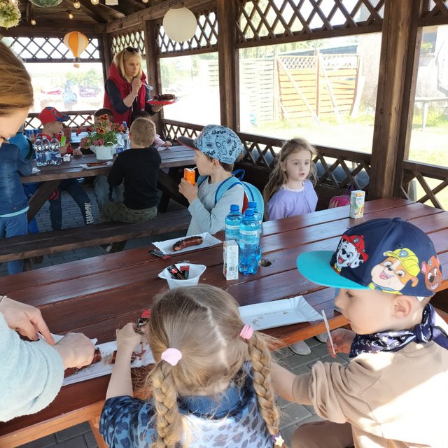 na belach z siana, przygotować pyszny posiłek w kuchni dla dzieci. Rodzice mogli również karmić zwierzątka, napić się kawy oraz odpocząć na leżaczkach. Atrakcji i zabawy było co niemiara. Zjedliśmy tam pyszną kiełbasę z grilla, która nam dała dużo siły w następnej zabawie – w przeciąganiu liny (rodzice kontra przedszkolaki) – oczywiście dzieci wygrały !
