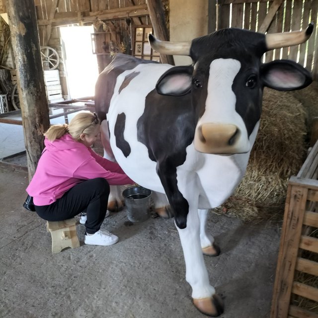 Na koniec pobytu każdy mały czy duży mógł spróbować swoich sił w dojeniu krowy, specjalnej do edukacji. Kto chciał mógł narysować sobie lub zostawić na specjalnej tablicy obrazek z alpaką. Po zrobieniu wspólnego zdjęcia, podziękowaliśmy za miłe przyjęcie oraz super atmosferę i szczęśliwi wróciliśmy do przedszkola. To był udany Dzień Dziecka .