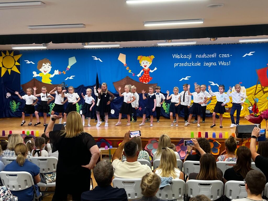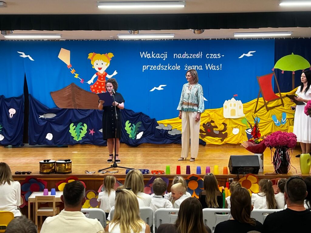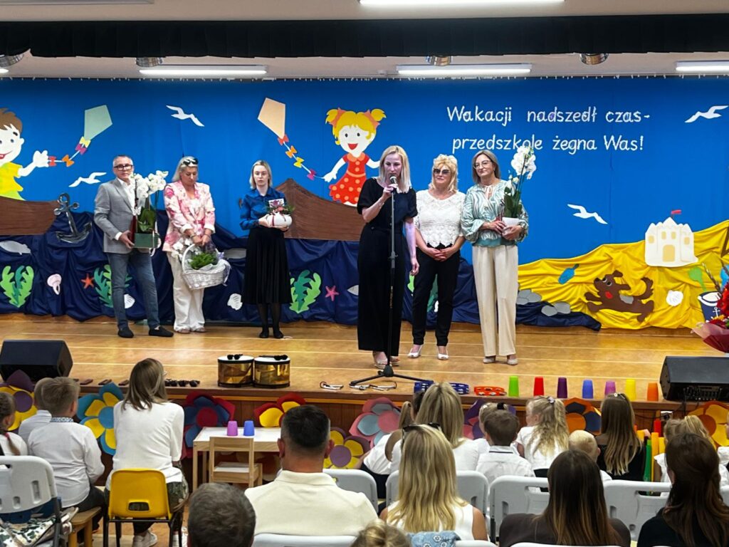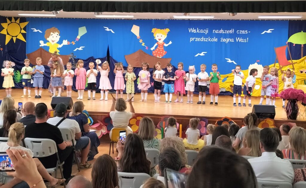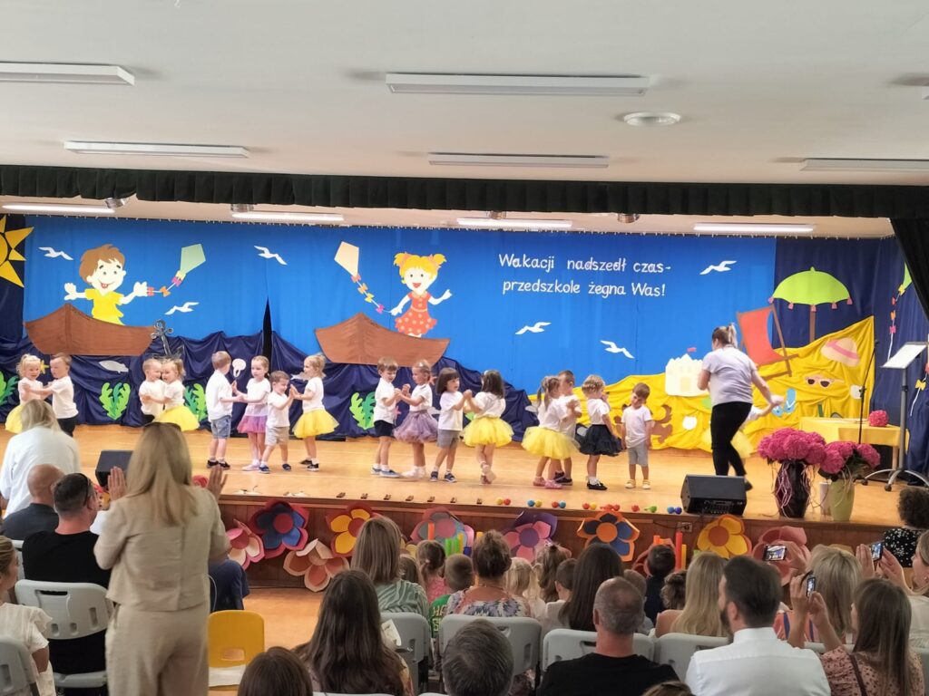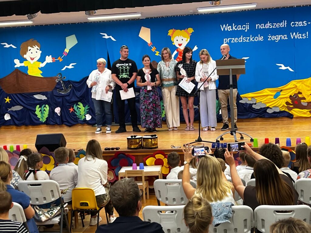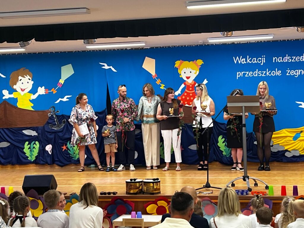 W czwartkowy dzień – 26.06.2025r. o godz. 10:00 odbyła się uroczystość zakończenie roku przedszkolnego w młodszych grupach ( Smerfy, Duszki oraz Misie), a o godz.13:30 odbyło się pożegnanie sześciolatków. Dziesięć miesięcy wspólnych zabaw i zajęć, podróży po porach roku i wycieczek szybko minęło, aż nadszedł czas wakacji i pożegnań. W uroczystościach zakończenia roku uczestniczyli też rodzice. Pierwsze wystąpiły trzylatki, czterolatki oraz pięciolatki, które pożegnały przedszkole na czas wakacji. O godz. 13:30 rozpoczął się występ sześciolatków. Starszaki dostojnie prezentowały swoje umiejętności artystyczne i taneczne. Wszystkie dzieci otrzymały z rąk pani Dyrektor nagrody książkowe oraz dyplomy, a rodzice którzy byli zaangażowani w działania naszej placówki otrzymali Statuetki „Przyjaciela Przedszkola”, Anioły oraz dyplomy.