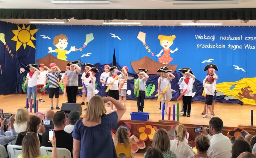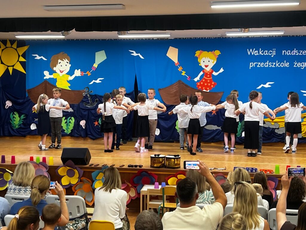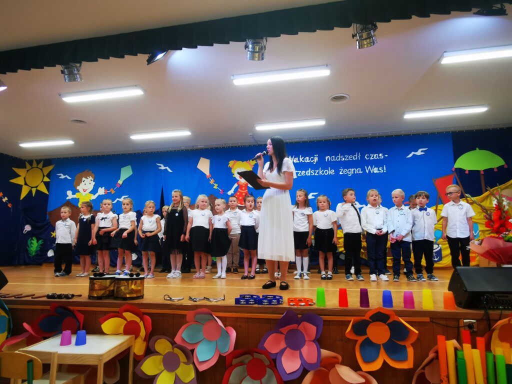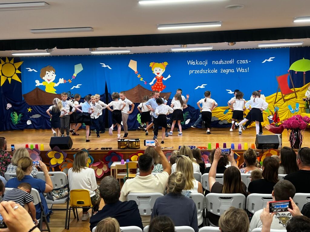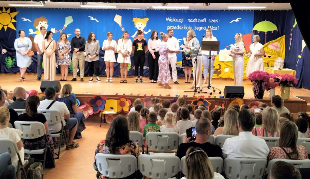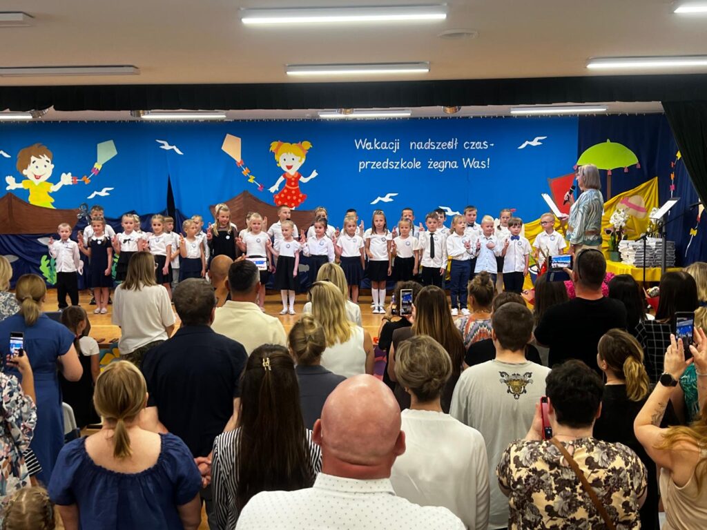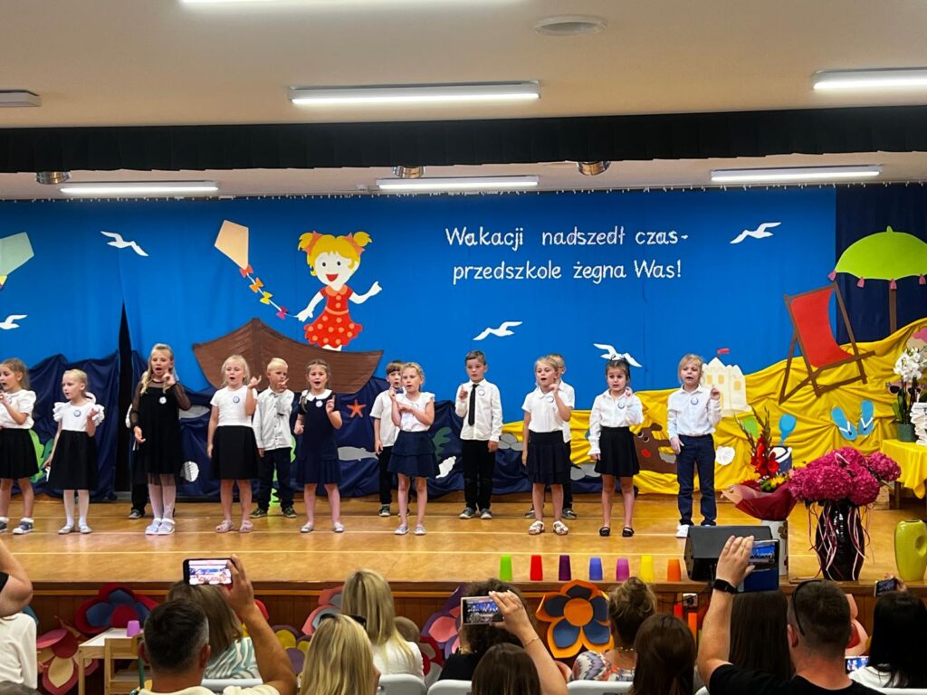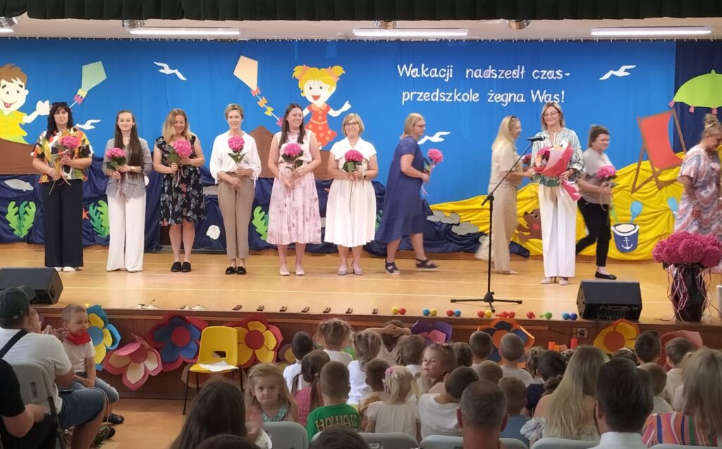 W czwartkowy dzień – 26.06.2025r. o godz. 10:00 odbyła się uroczystość zakończenie roku przedszkolnego w młodszych grupach ( Smerfy, Duszki oraz Misie), a o godz.13:30 odbyło się pożegnanie sześciolatków. Dziesięć miesięcy wspólnych zabaw i zajęć, podróży po porach roku i wycieczek szybko minęło, aż nadszedł czas wakacji i pożegnań. W uroczystościach zakończenia roku uczestniczyli też rodzice. Pierwsze wystąpiły trzylatki, czterolatki oraz pięciolatki, które pożegnały przedszkole na czas wakacji. O godz. 13:30 rozpoczął się występ sześciolatków. Starszaki dostojnie prezentowały swoje umiejętności artystyczne i taneczne. Wszystkie dzieci otrzymały z rąk pani Dyrektor nagrody książkowe oraz dyplomy, a rodzice którzy byli zaangażowani w działania naszej placówki otrzymali Statuetki „Przyjaciela Przedszkola”, Anioły oraz dyplomy.