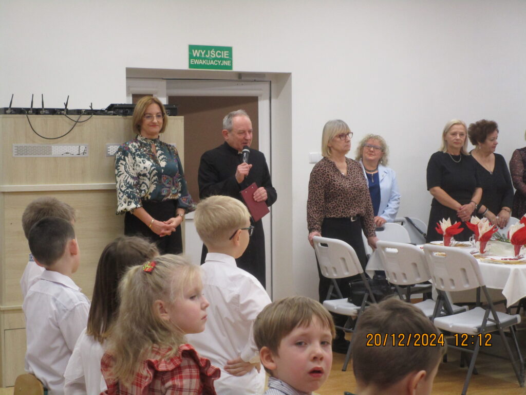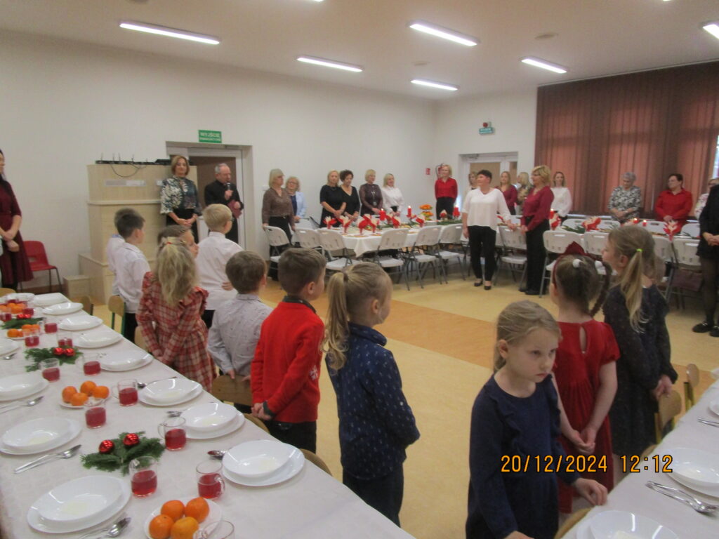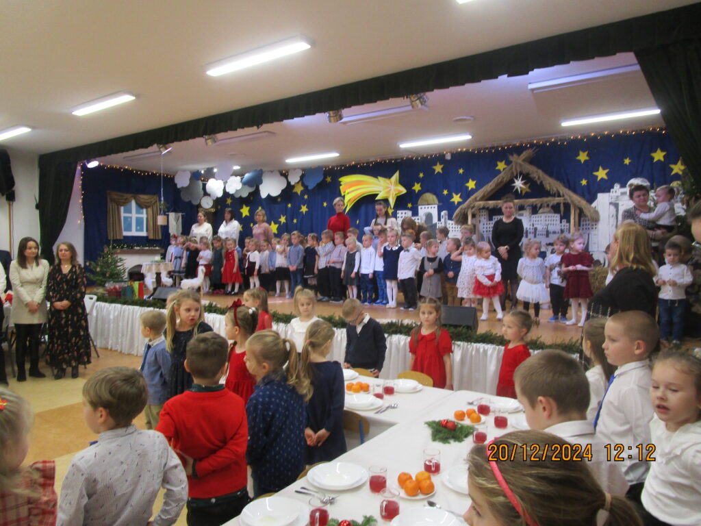 20.12.2024, w dzień obiadu wigilijnego panowała radosna, ożywiona atmosfera. Świąteczne dekoracje oraz dzieci w galowych strojach wprowadzały nastrój oczekiwania na wyjątkowe, niecodzienne wydarzenie. Spotkanie rozpoczęło się od wspólnych życzeń i kolędowania. Na stole pojawiła się tradycyjna ryba, a także inne świąteczne przysmaki. Nie zabrakło również prezentów, które dzieci znalazły pod choinką.