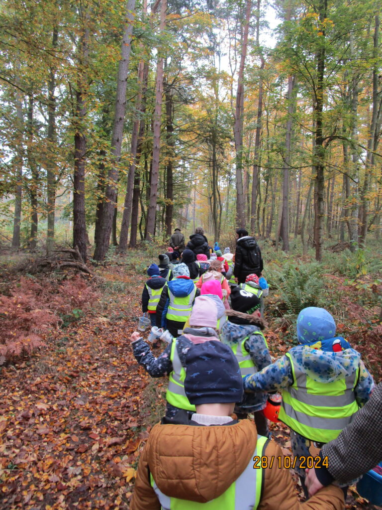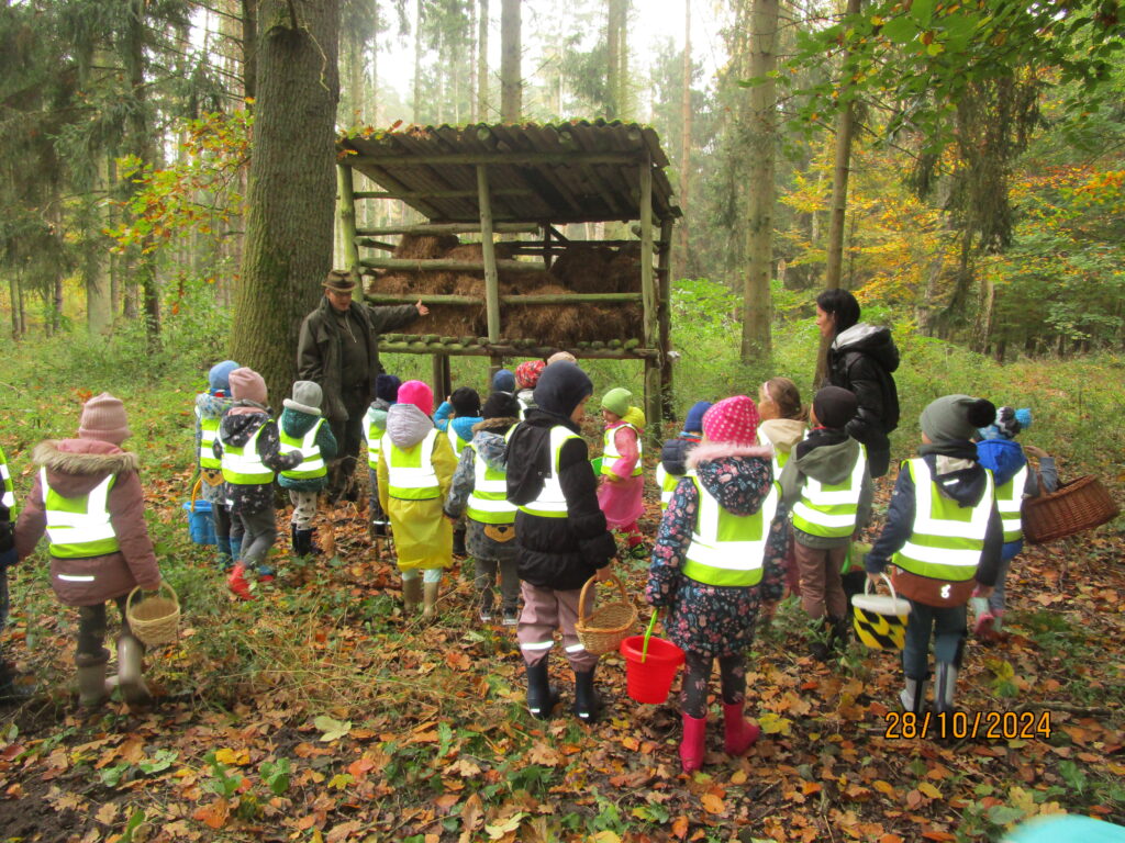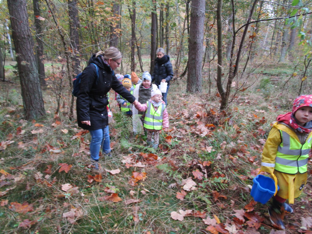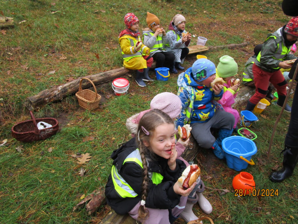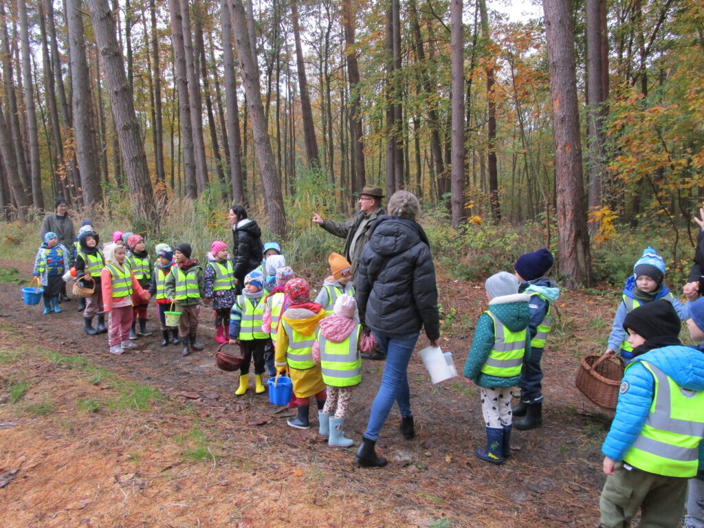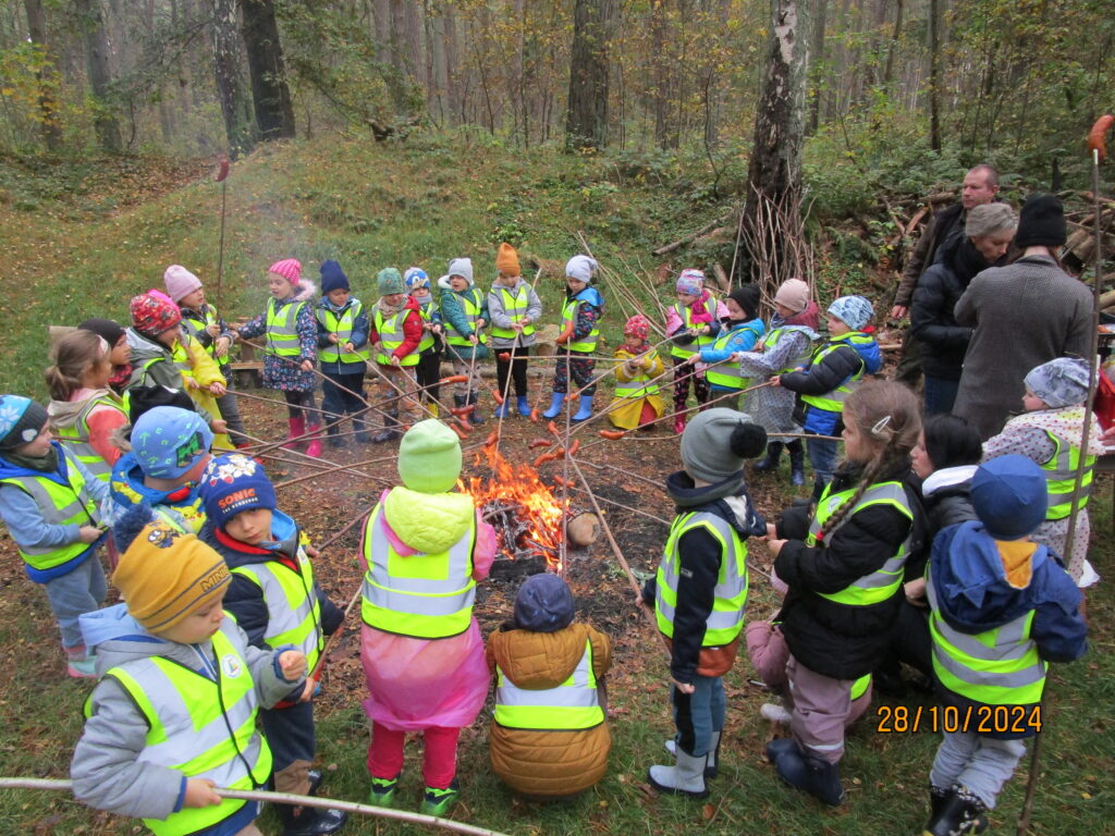 W poniedziałkowy poranek, po smacznym śniadaniu dzieci z grupy II „Duszki” i IV „Tygryski” wraz z paniami wybrały się na wycieczkę do lasu w Nadleśnictwie Pobierowo. Przedszkolaki zaopatrzone w kalosze i koszyczki do zbierania leśnych skarbów, chętnie wsiadły do autokaru, który wyruszył w stronę Łukęcina. Na skraju lasu powitał nas zaprzyjaźniony leśniczy – Pan Mirosław Jarosik. Głównym celem wizyty w lesie było przybliżenie dzieciom środowiska przyrodniczego, jakim jest las. Mieliśmy okazję doświadczać tego przy pomocy wielu zmysłów (wzorku, słuchu i dotyku). Pan leśniczy wyjaśnił nam dlaczego w lesie są ogrodzenia (chodzi o to, żeby zwierzyna nie zjadała młodych drzewek, z których wyrośnie olbrzymi las). Poznaliśmy i obserwowaliśmy różnorodność szaty roślinnej lasu, m.in.: drzewa liściaste i iglaste, krzewy, runo leśne i mchy. Oglądaliśmy nawet z bliska stołówkę dla zwierząt – paśnik i dzięki panu leśniczemu, dowiedzieliśmy się czym żywią się leśne zwierzęta. Po drodze widzieliśmy buchtowiska, które skłoniły nas do recytowania znanego wierszyka: „Dzik jest dziki, dzik jest zły. Dzik ma bardzo ostre kły. Kto spotyka w lesie dzika, ten na drzewo szybko zmyka.”. Dodatkowo przedszkolaki wykazały się świetną wiedzą podczas rozwiązywania zagadek, porównań oraz quizu na temat lasu i zwierząt w nim żyjących. W trakcie spacerowania dzieci bardzo chętnie zbierały do swoich koszyczków dary lasu (gałęzie, liście, szyszki, żołędzie, itp.), a największą frajdę sprawiło im poszukiwanie grzybów (oczywiście pod nadzorem pana Mirosława i pań). Na zakończenie naszej leśnej przygody pan leśniczy zaprosił nas na ognisko, na którym mieliśmy możliwość przyrządzenia sobie kiełbasek, które w połączeniu ze świeżym powietrzem smakowały wybornie. W podziękowaniu za interesujące zajęcia przyrodnicze wręczyliśmy panu leśniczemu laurki, które sami wykonaliśmy i obiecaliśmy Leśnym Skrzatom że jeszcze nieraz odwiedzimy ich dom (las) z zachowaniem wszystkich zasad, które utrwaliliśmy. Zmęczeni, ale szczęśliwi wróciliśmy bezpiecznie do naszego przedszkola.