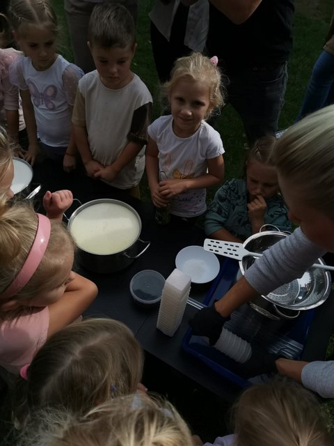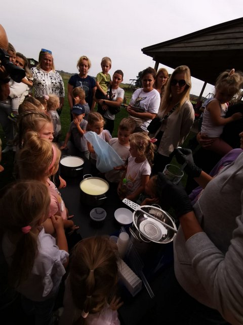 Gospodarze zaprosili wszystkich do farmy proponując zwiedzanie jej całej , oglądanie miejsc w których zwierzęta mieszkają, karmienie marchewką i jabłkami pięknych różnokolorowych alpaków, królików, kóz, owiec, krów. Głaskanie, dotykanie, karmienie to doświadczenia, które umożliwiły wszystkim uczestnikom zdobycie wiedzy o zwierzętach hodowlanych w tym gospodarstwie. Dzieci brały udział w udoju sztucznej krowy oraz poznały smak mleka przez degustację prawdziwego mleka. Ważnym punktem wycieczki była pomoc dzieci w tworzeniu serków podpuszczkowych. Był grill z pieczonymi kiełbaskami oraz przepyszna pizza. Dużą atrakcją był plac zabaw oraz przejazd ,,Beczkowym pojazdem”. Na koniec wycieczki dzieci wykazały się dużą wiedzą w quizie ,,Wiedzy o mleku i przetworach mlecznych’’.