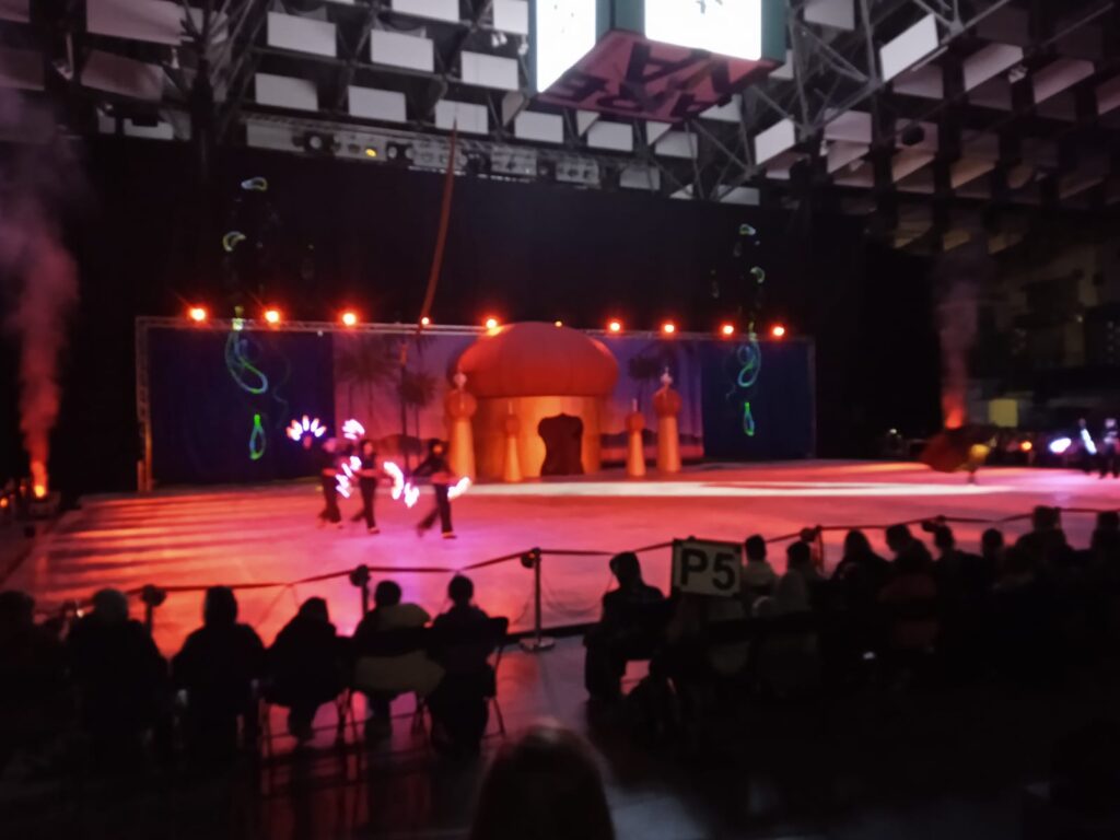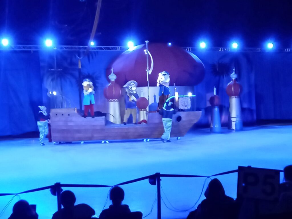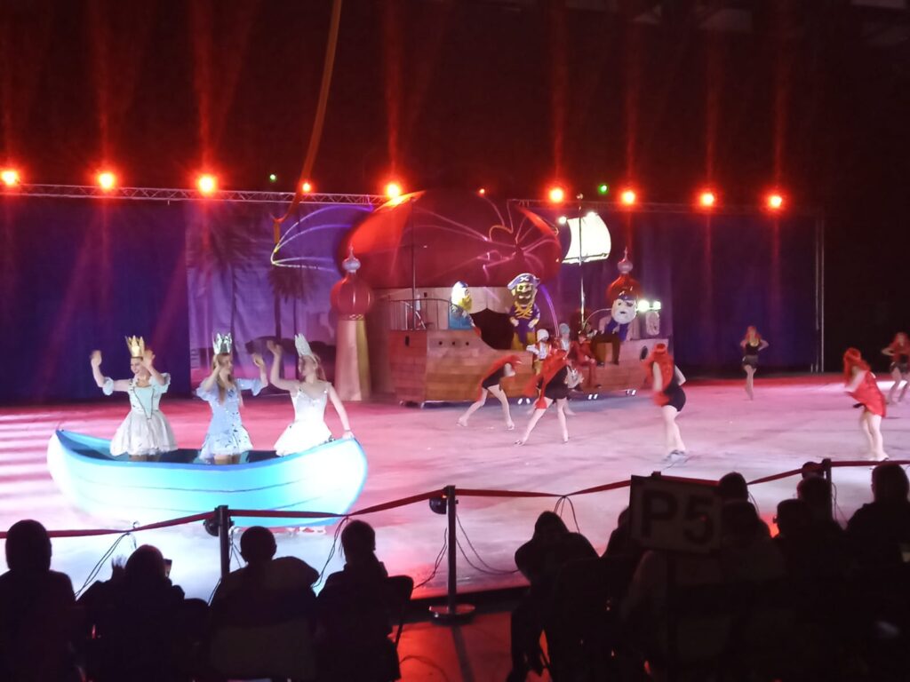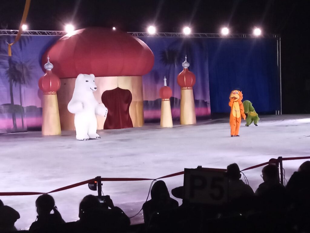 W czwartkowy poranek, dnia 7 listopada dzieci z grupy „Gumisie” i „Tygryski” wraz z paniami wybrały się na wycieczkę do Netto Areny w Szczecinie na widowisko teatralne na lodzie pod tytułem „Niezwykłe przygody Sindbada Żeglarza” na motywach baśni Bolesława Leśmiana. Na początku wyprawy dzieci utrwaliły zasady bezpiecznego podróżowania autokarem oraz zasady poruszania się w miejscu użyteczności publicznej. Na lodowisku podziwialiśmy pełne popisów choreografie zawierające trudne elementy jazdy figurowej na lodzie przy znakomitej oprawie muzycznej. Zachwyt dzieci wzbudziły również wspaniałe kostiumy oraz liczne efekty specjalne, takie jak: dym, taniec na podwieszonej szarfie oraz ledowe show. Całość przedstawienia dopełniała niezwykła sceneria – zamek, wyspa z palmami oraz ruchomy statek piracki. Nasz główny bohater – Sindbad odwiedzał odległe krainy w poszukiwaniu szczęścia i miłości. Po wielu trudach które sprowadzał na niego diabeł morski, odnalazł je na ostatniej z wysp. Jednak najpierw musiał pokonać czarnoksiężnika, żeby rozpocząć z księżniczką długie i szczęśliwe życie.