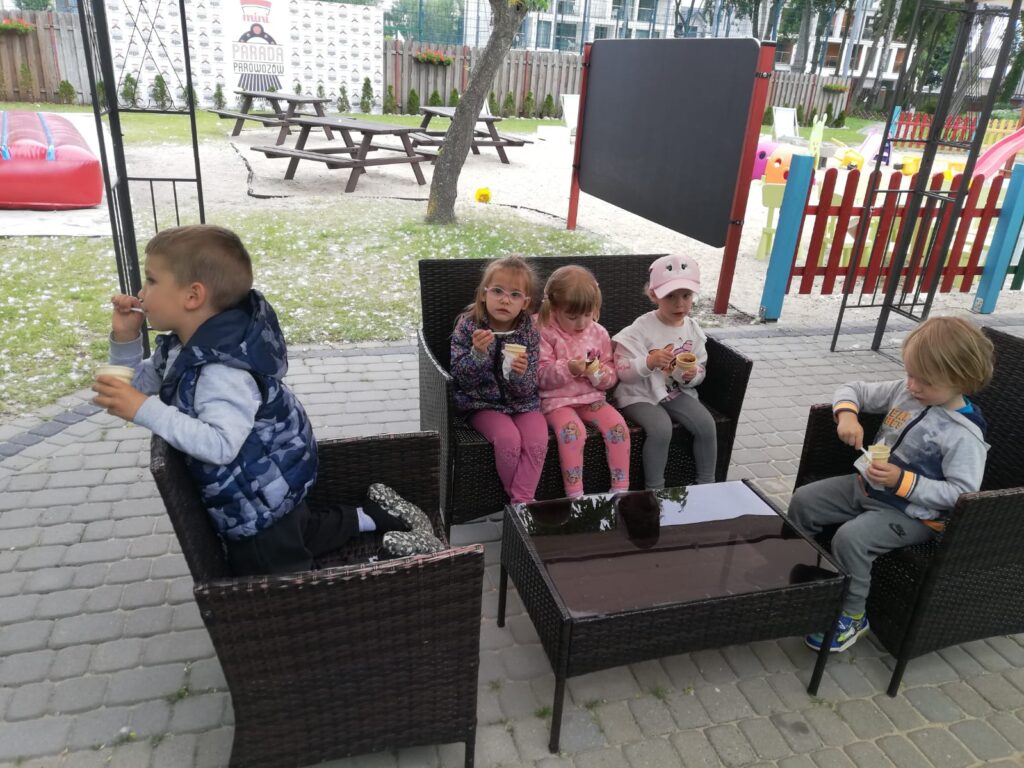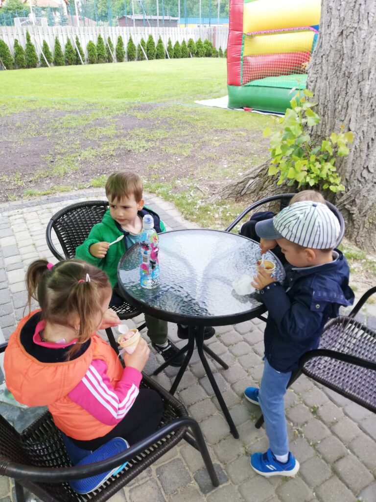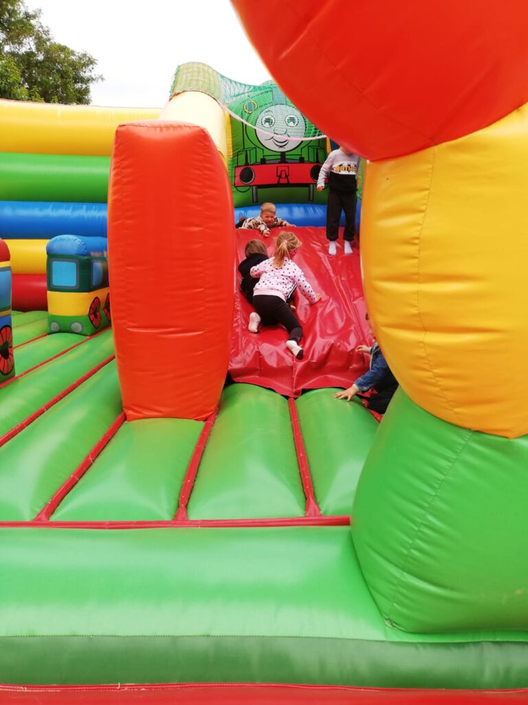 Zabawy na „dmuchańcach” i placu zabaw oraz lody i gofry dopełniły poziom szczęścia. Styropianowe lokomotywy do pomalowania zostały zabrane do przedszkola, by tam mogły być dokończone.