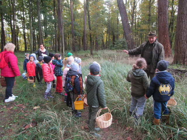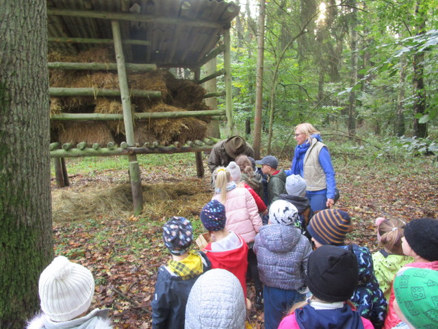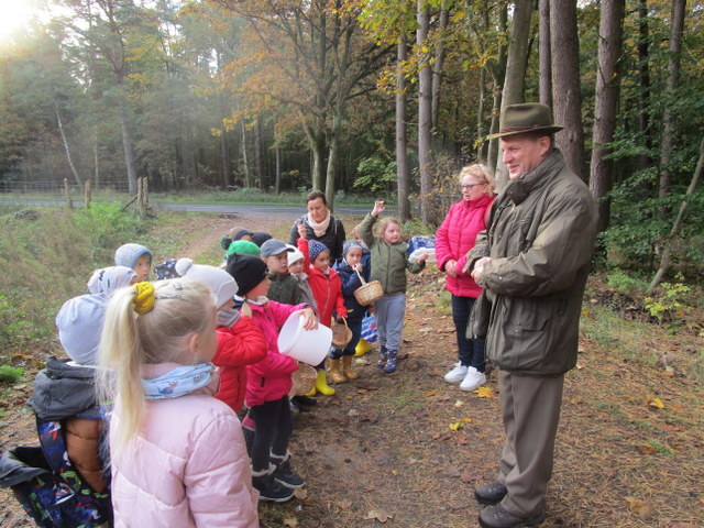 W lesie przywitał nas Leśniczy Nadleśnictwa Gryfice – pan Mirosław Jarosik, który zaprosił nas na jesienny spacer leśnymi dróżkami. Pan leśniczy bardzo ciekawie opowiadał o organizacji, nadzorze i zarządzaniu leśną gospodarką. Przedszkolaki zobaczyły uprawę młodych dębów, dowiedziały się, ile lat rośnie las oraz zrozumiały jakie znaczenie ma dla ludzi i zwierząt. Miały okazję poznać różnorodność szaty roślinnej lasu: drzewa iglaste, liściaste, krzewy oraz runo leśne. Zobaczyły paśnik, czyli „stołówkę dla zwierząt”, dowiedziały się co to lizawka i do czego służy. Usłyszały, że zwierzęta dokarmiane są najczęściej w okresie zimowym, a głównym ich pożywieniem są ziemniaki, buraki, siano oraz kostki soli.