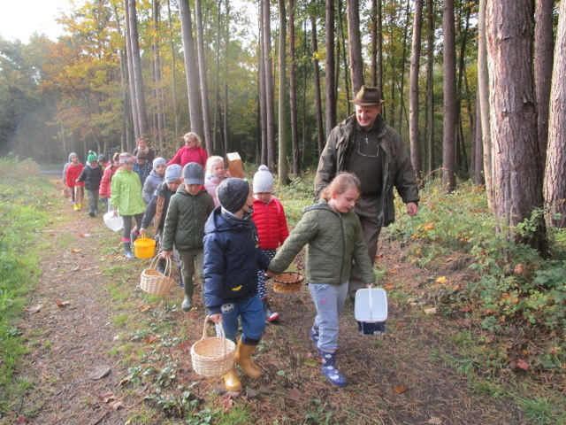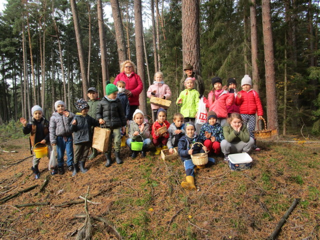W trakcie spaceru udało się zebrać skarby lasu do kącika przyrody: szyszki, kolorowe liście, buczynę oraz suche igły, które spadły z drzew. Udało się także znaleźć kilka grzybów, które pomagał rozpoznać pan leśniczy.