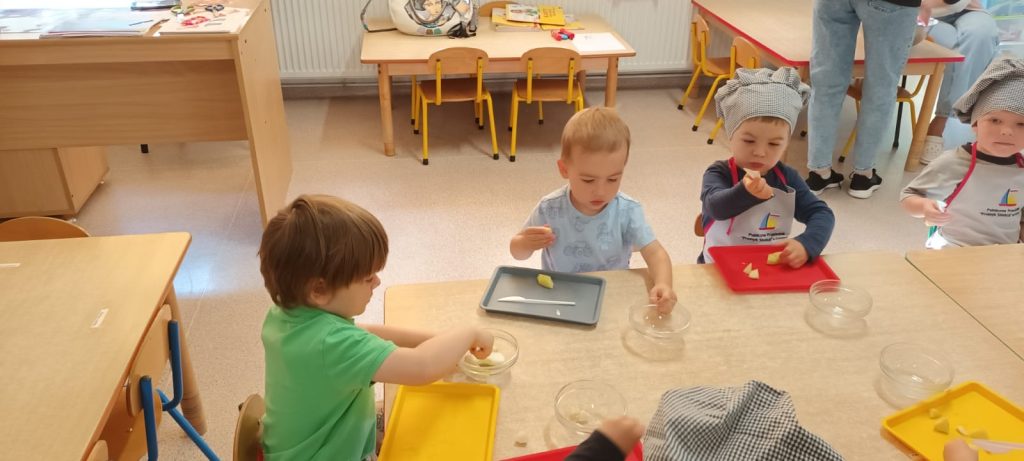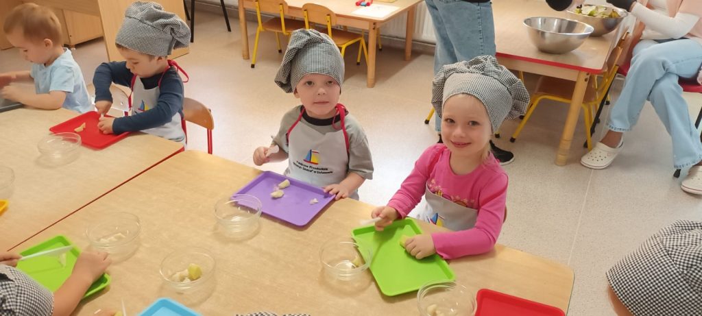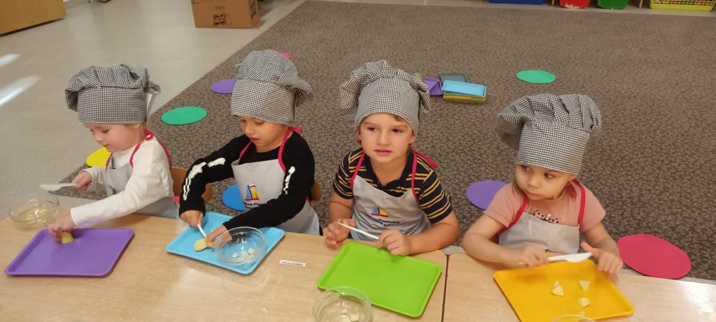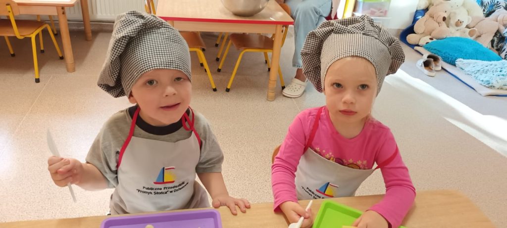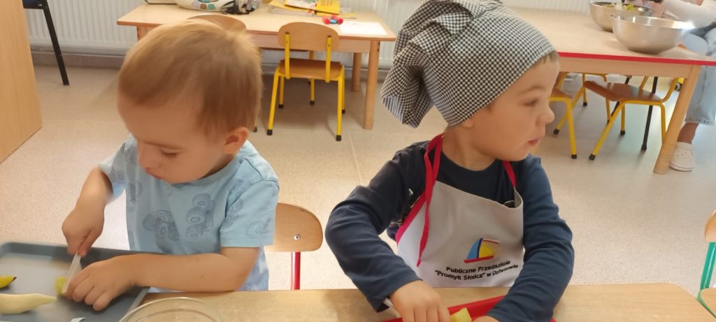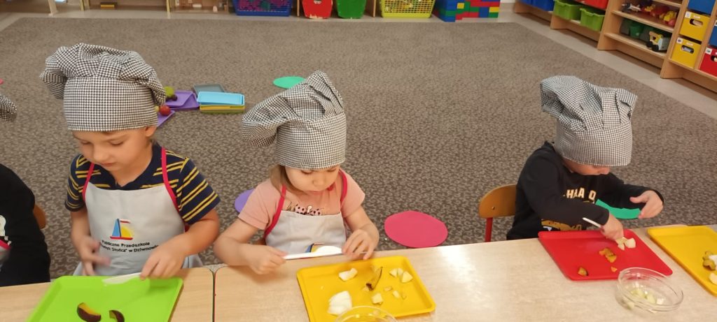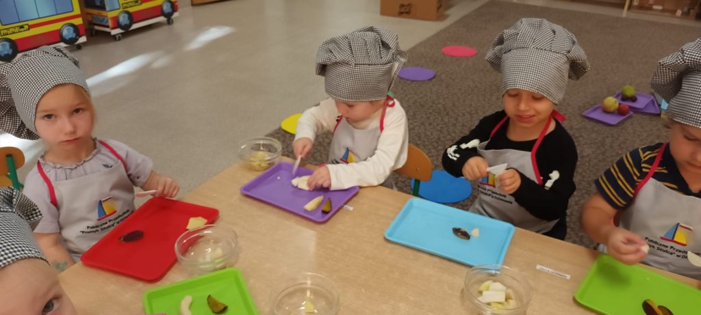W środę 24 września dzieci z grupy Smerfy samodzielnie przygotowały pyszną, kolorową i witaminową sałatkę owocową. Taka witaminowa przekąska jest alternatywą dla słodyczy, które tak bardzo lubimy. Wszystkie dzieci ubrane w stroje kucharzy zabrały się do pracy wcześniej dokładnie myjąc ręce i pamiętając o zasadach higieny. Przedszkolaki pokazały, że potrafią bezpiecznie posługiwać się plastikowym nożem podczas krojenia owoców na małe kawałki. Wszystkim dzieciom wyjątkowo smakowały owoce w takiej postaci, tym bardziej że był to efekt ich pracy.