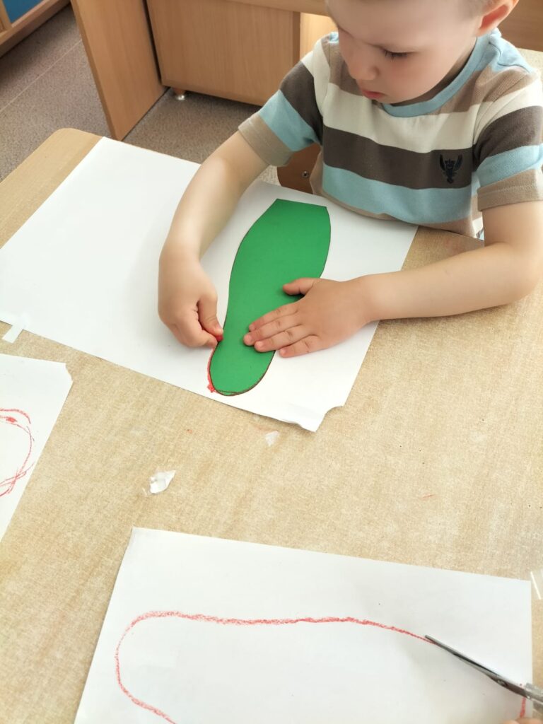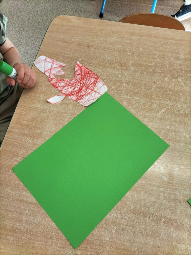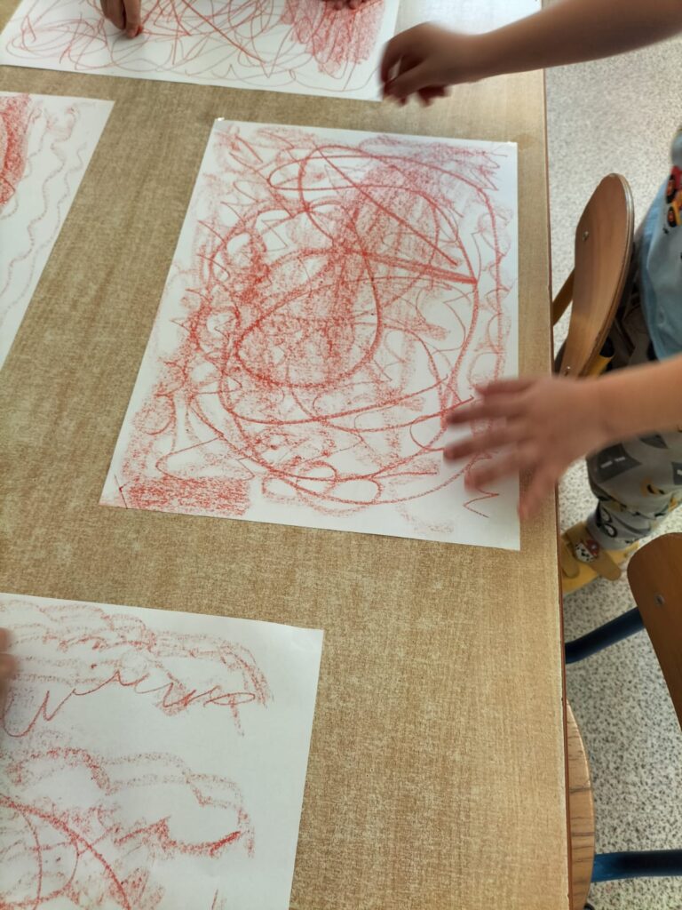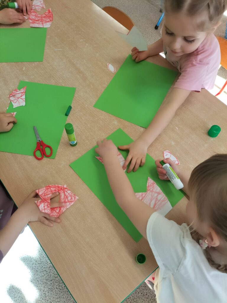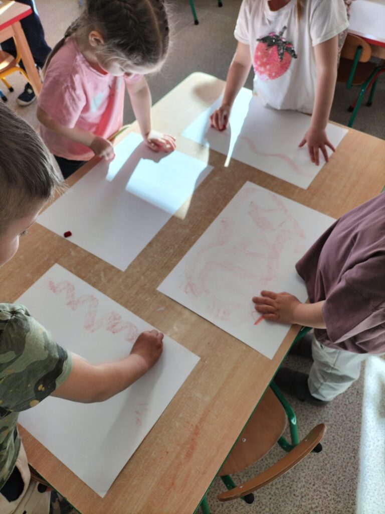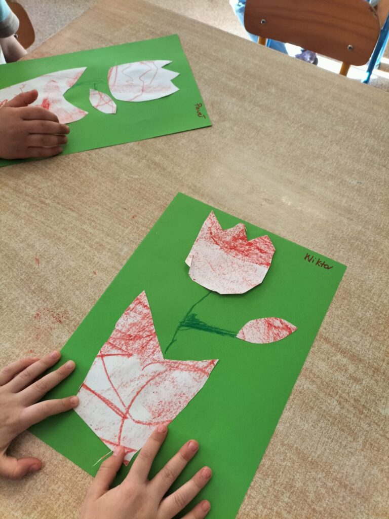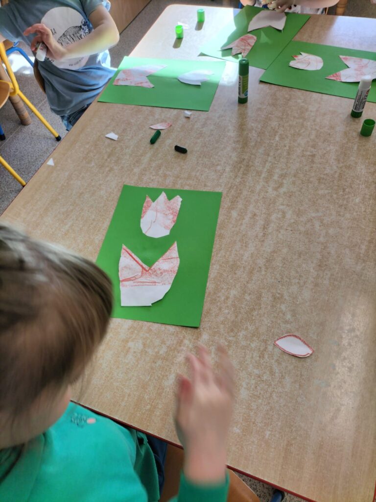 Dzieci wykonały wiosenną pracę. Za pomocą rytmicznych ćwiczeń przy optymalnym ruchu całego ciała i przy muzyce stworzyły Tulipany. Zabawa polegała na przesuwaniu się po obwodzie i kreśleniu w rytm muzyki ( utwór Abhaile) różnych wzorów na kartkach, następnie po odrysowaniu kręgla został on wycięty i z niego powstał wiosenny kwiat.