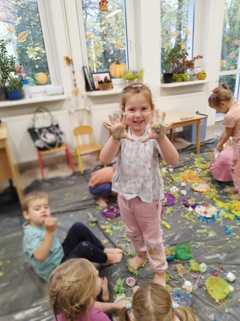 Kolorowe brudzenie rozwija sensorycznie, poznawczo a także społeczno-emocjonalnie.